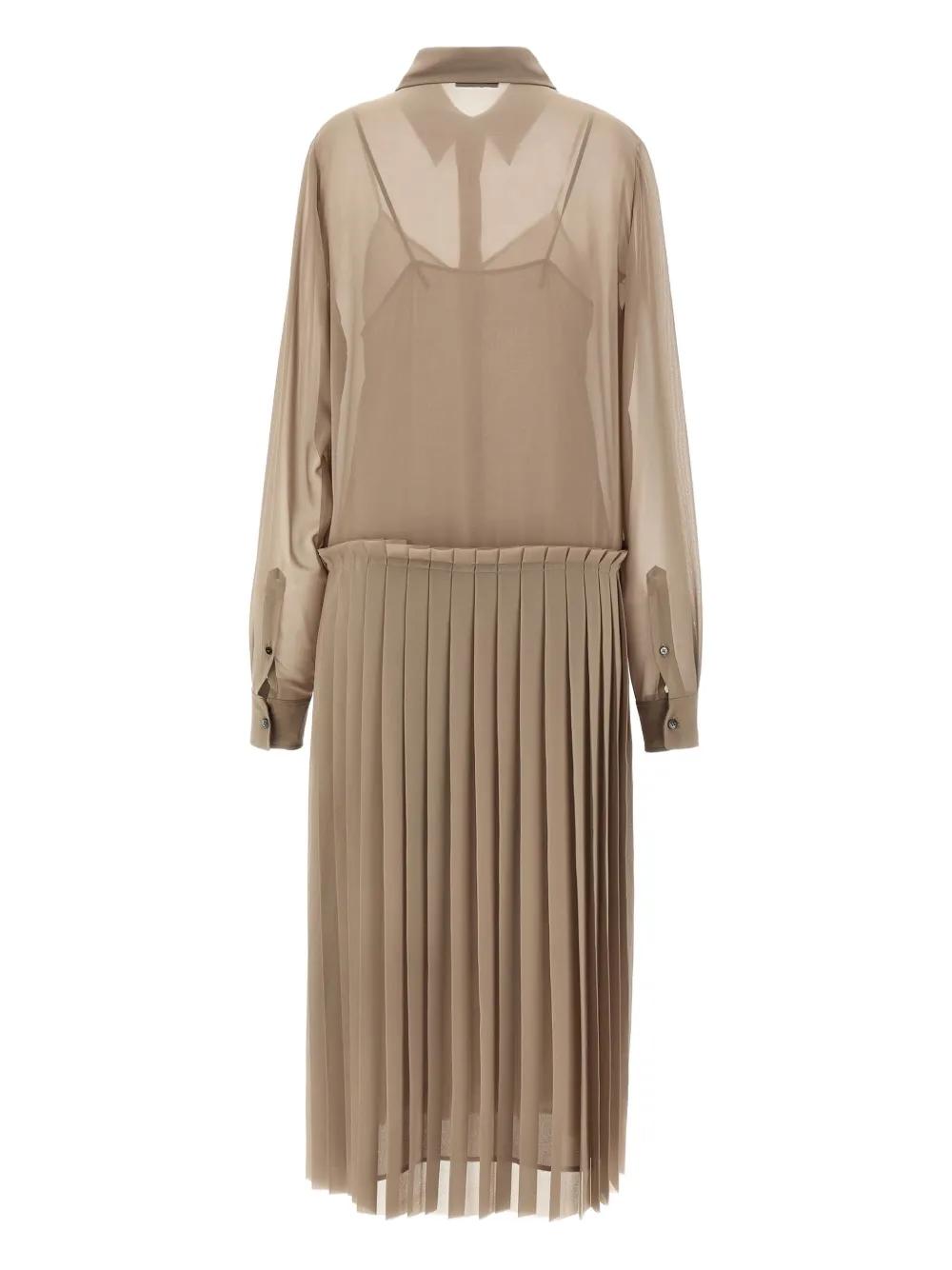 beige pleated skirt long cuffed sleeves concealed button closure classic collar