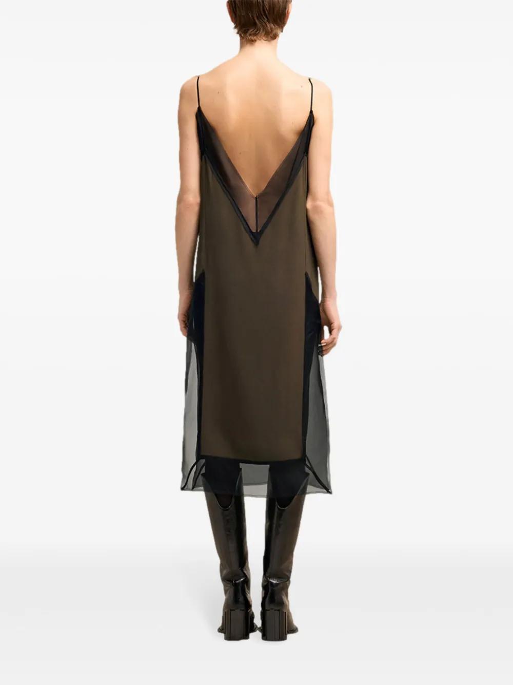 coffee brown semi-sheer construction V-neck V-back thin straps mid-length