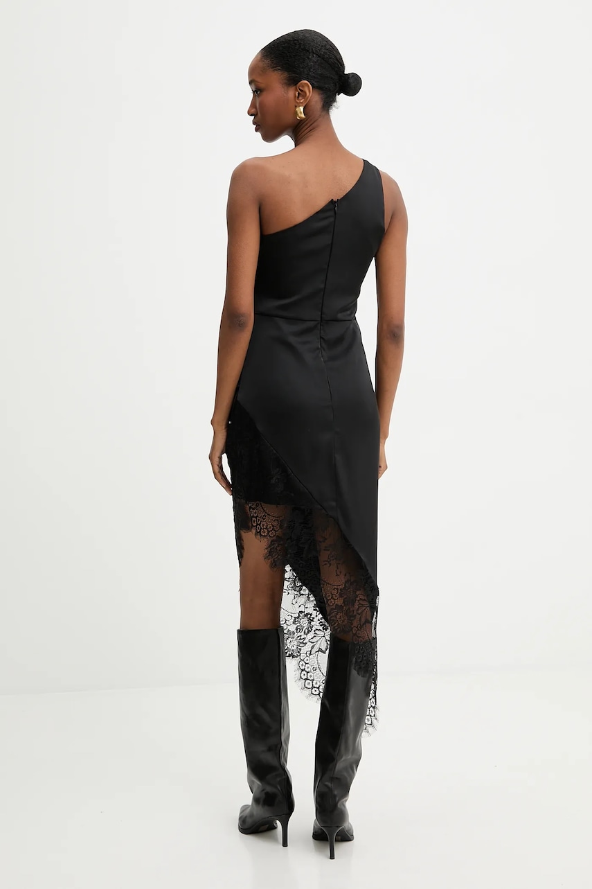 - Dopasowany, podkreślający sylwetkę fason. - Model na jedno ramię. - Nieregulowane, nieodpinane ramiączko. - Asymetryczny dekolt. - Z tyłu zapięcie na kryty suwak. - Wbudowane wkładki lekko usztywniają, dodatkowo stabilizują i unoszą biust. - Ozdobne marszczenia. - Koronkowe wstawki. - Dodatkowa warstwa materiału w postaci podszewki. - Długość: 131/66 cm. - Szerokość pod pachami: 39 cm. - Szerokość w talii: 32,5 cm. - Szerokość w biodrach: 44 cm. - Wymiary podane dla rozmiaru: S.
