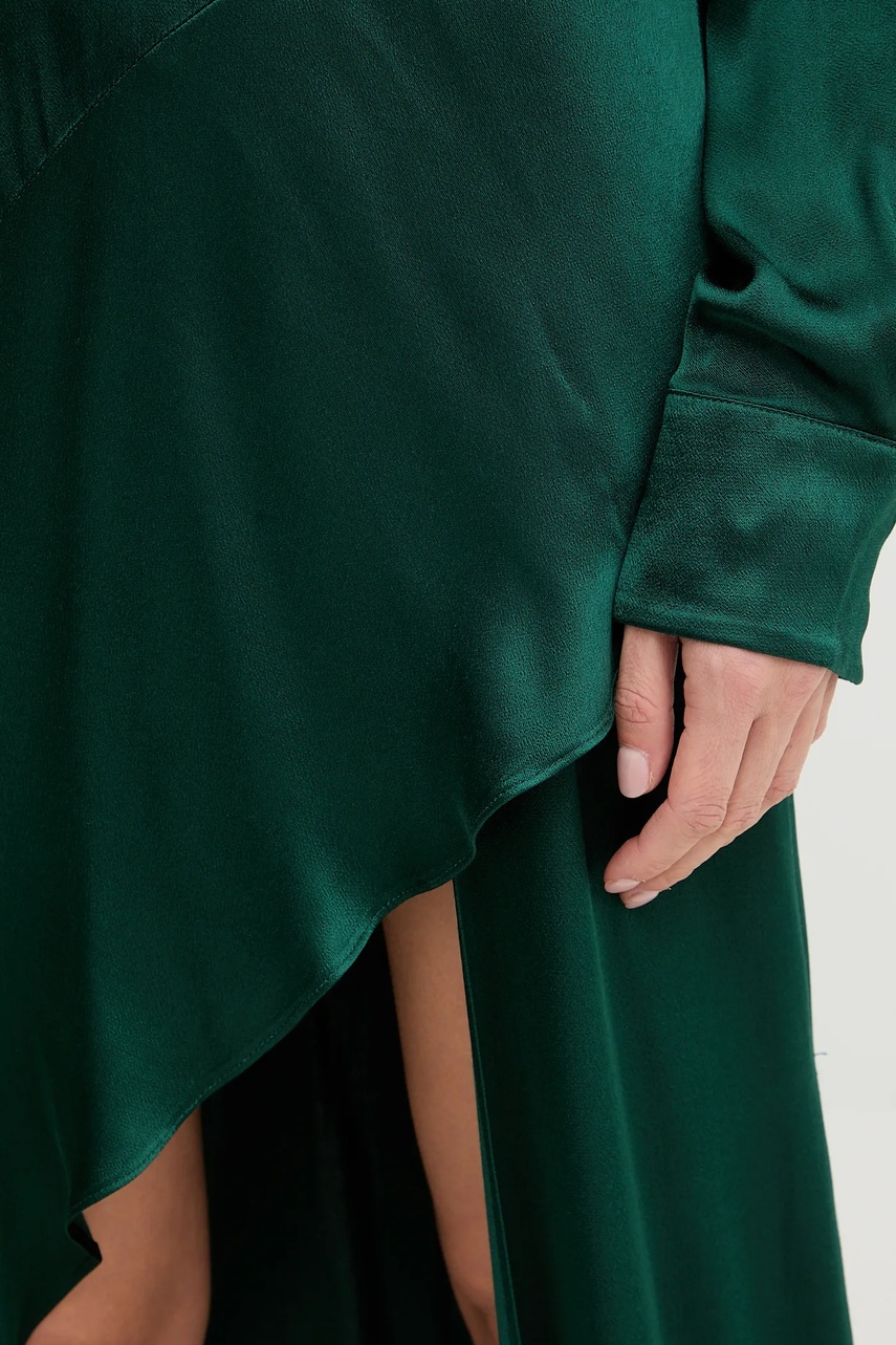 - Rozkloszowany fason. - Asymetryczny model. - Klasyczny, okrągły dekolt. - W ramiona wszyte poduszki. - Mankiety zapinane na guziki. - Z tyłu zapięcie na suwak. - Rękaw raglanowy, dzięki swojej konstrukcji, zapewnia większą swobodę ruchu. - Długość z przodu: 75 cm. - Długość z tyłu: 150 cm. - Szerokość w talii: 36 cm. - Wymiary podane dla rozmiaru: S.