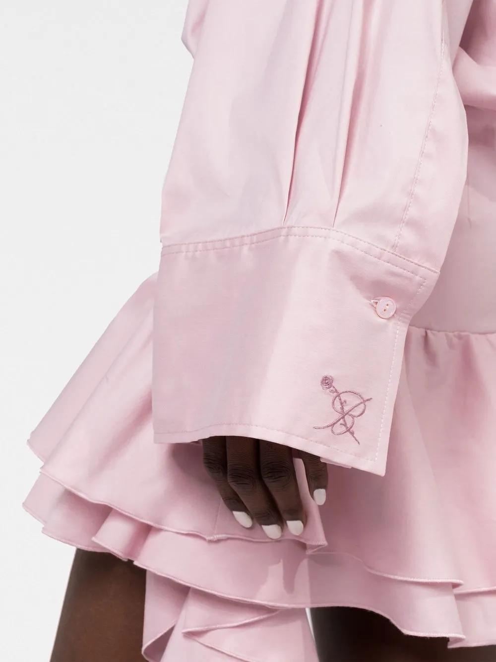 light pink cotton blend ruffled detailing embroidered logo at the sleeve straight-point collar front button placket dropped waist long sleeves buttoned cuffs tiered skirt thigh-length