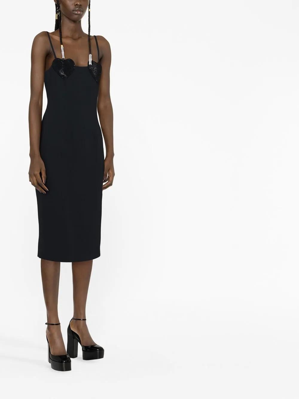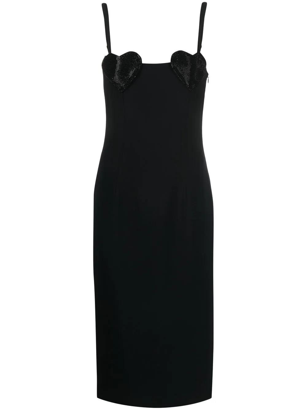 black heart-shaped appliqués crystal embellishment square neck spaghetti straps central rear vent straight hem