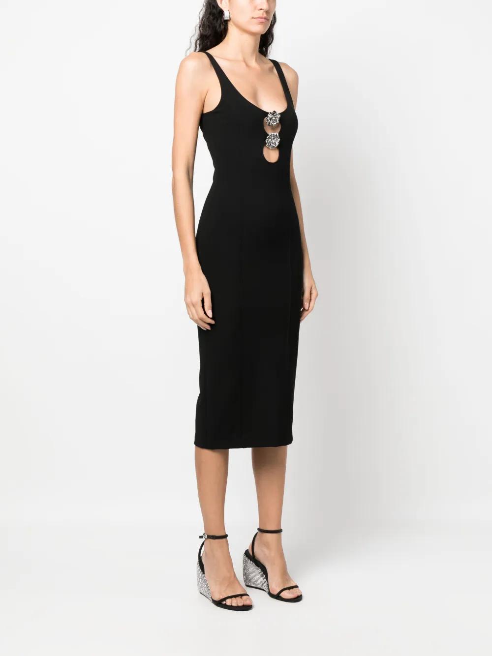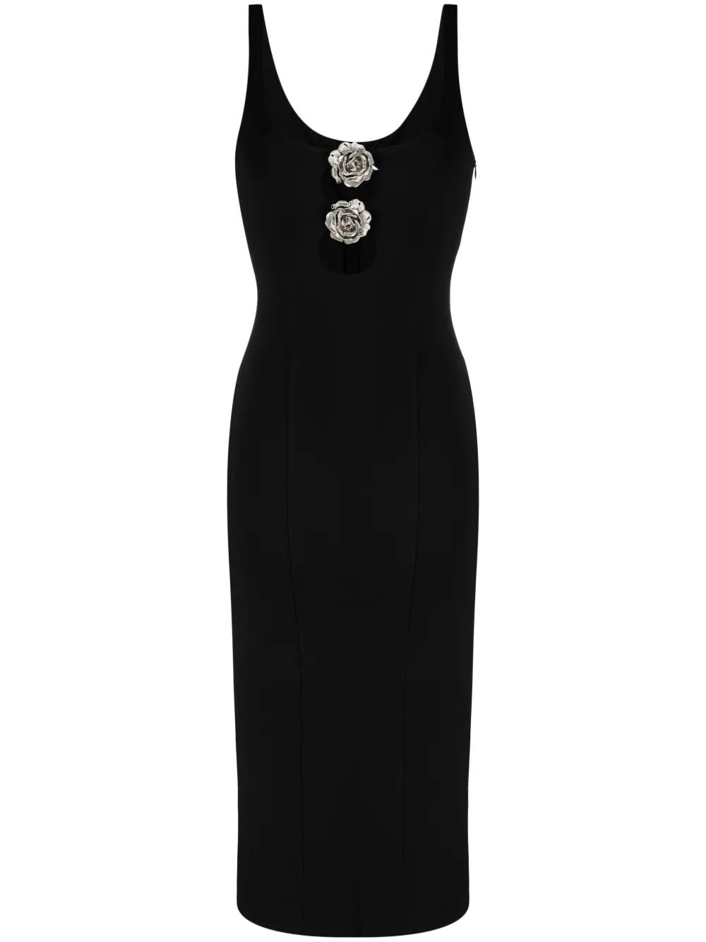 black stretch-design plunging U-neck floral appliqué cut-out detailing sleeveless rear slit calf-length straight hem