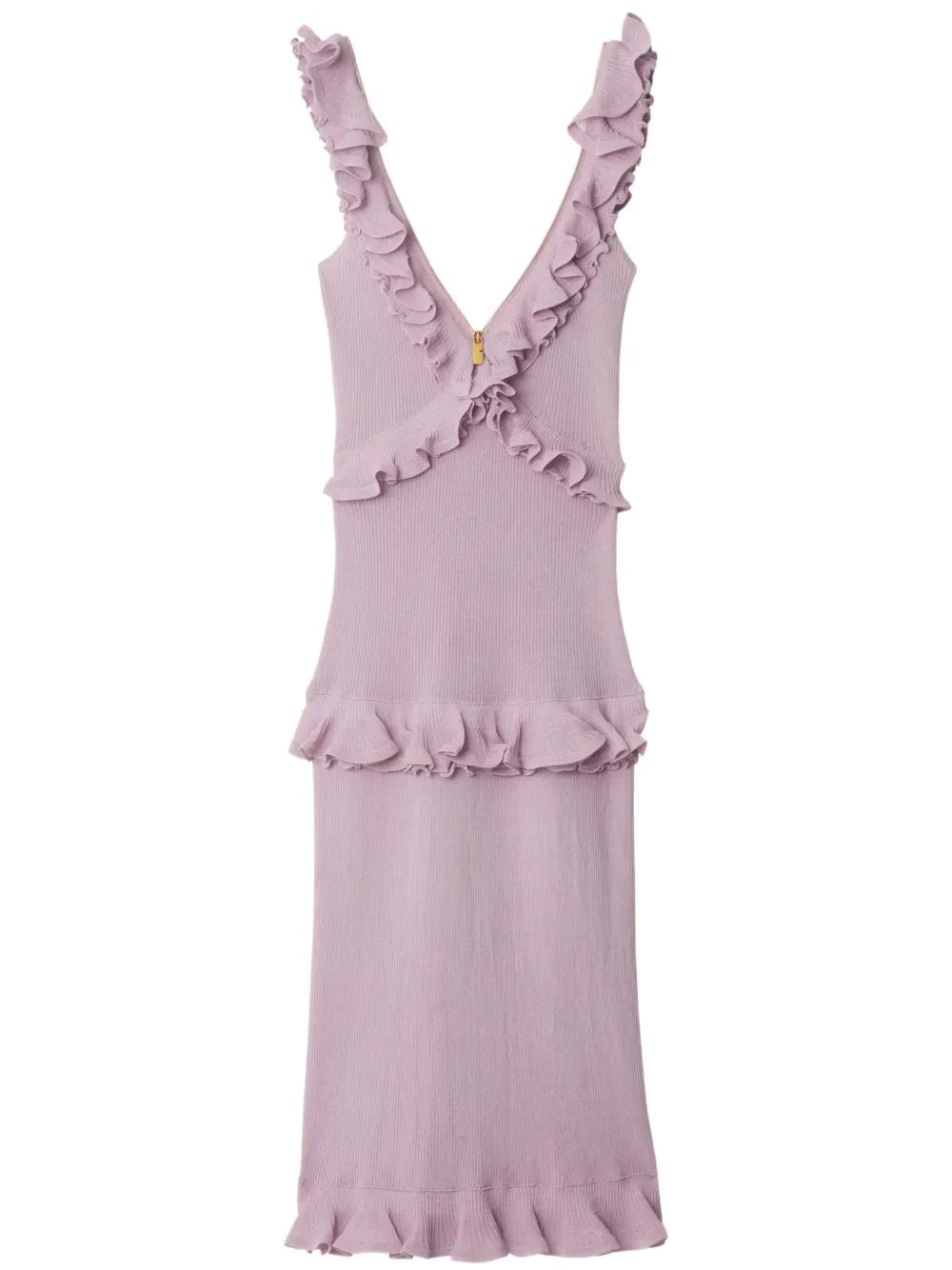 mauve zip fastening V-neck sleeveless ruffled detailing