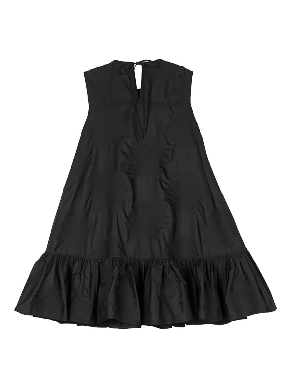 black jacquard pattern ruffled hem sleeveless rear tie fastening round neck