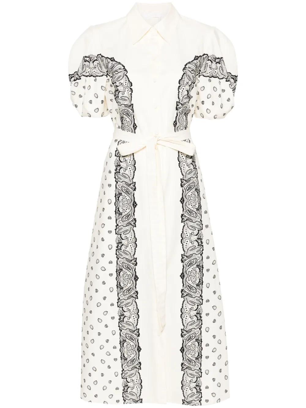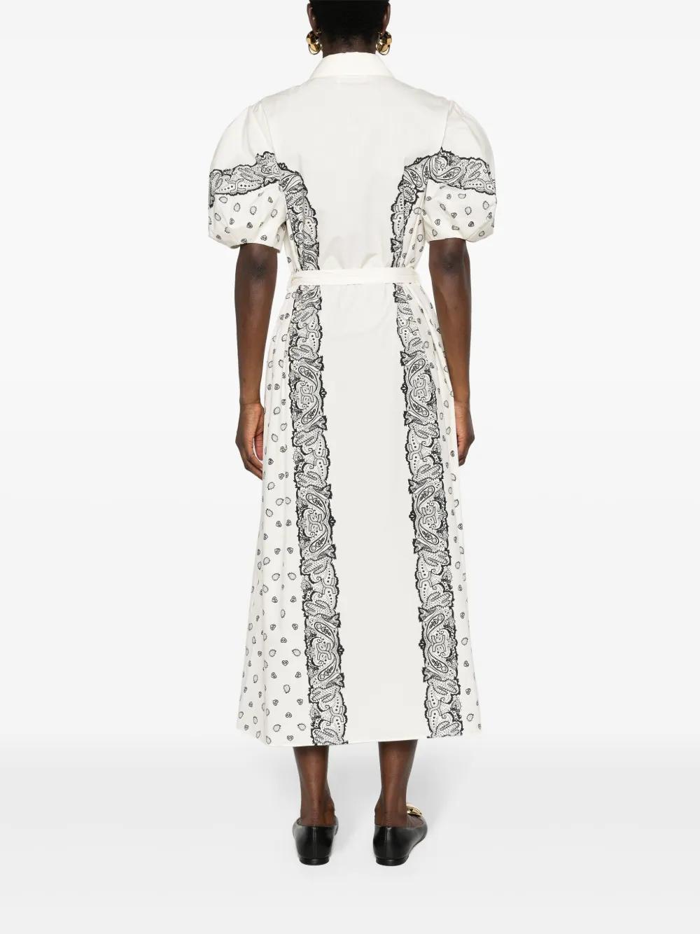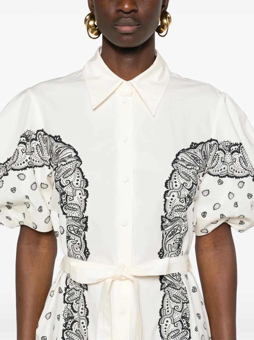 off-white/black cotton poplin texture bandana print straight-point collar front button fastening short puff sleeves tied waist two side slit pockets straight hem mid-length unlined