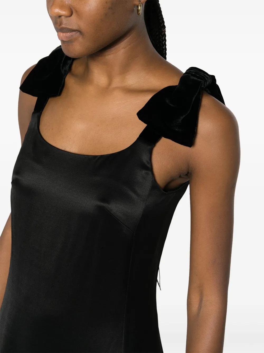 black wool-silk blend satin weave velvet trim bow detailing square neck sleeveless concealed rear hook and zip fastening straight hem mid-length silk lining