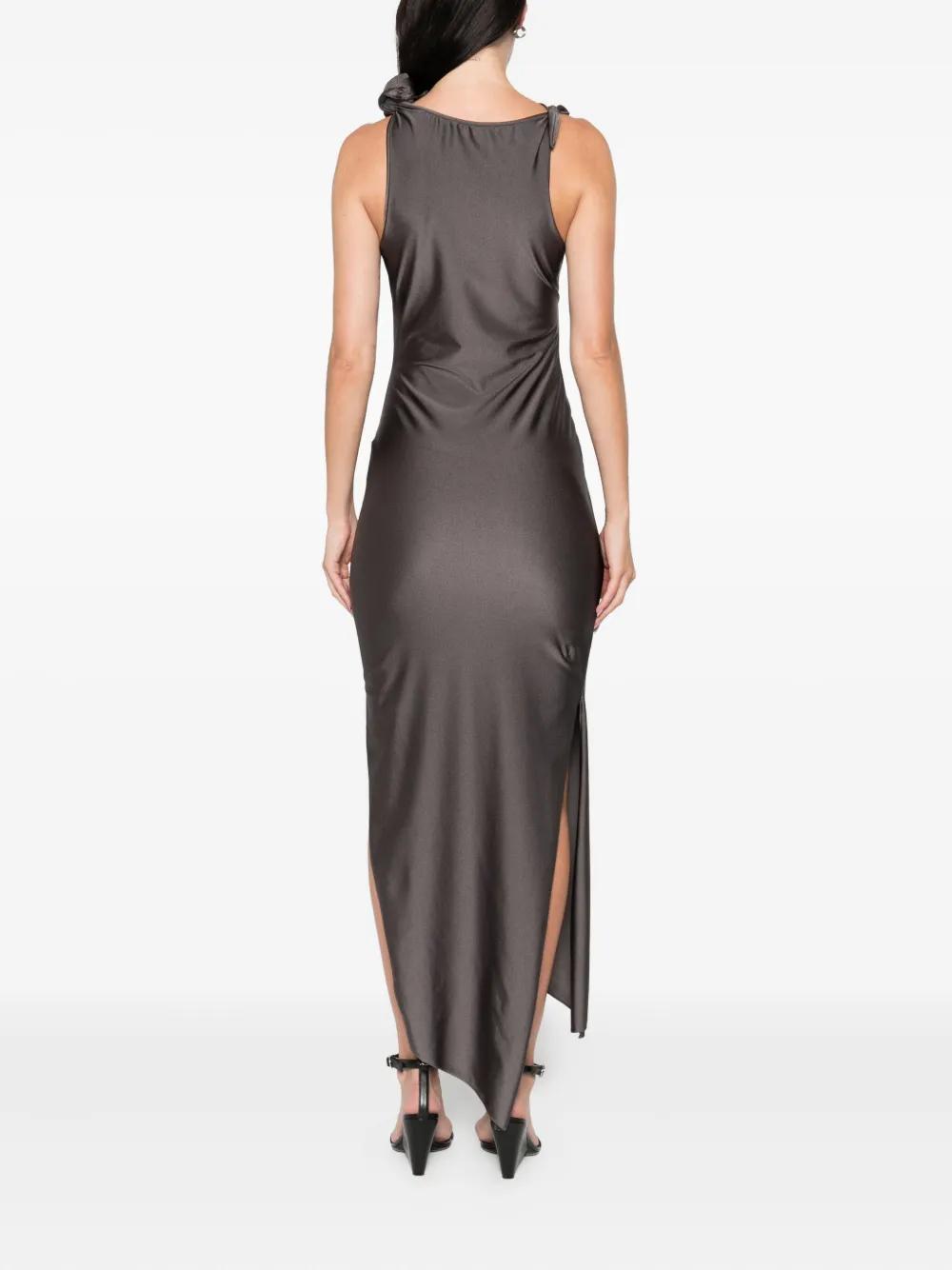 grey flower detail ties strap asymmetric hem sleeveless draped design