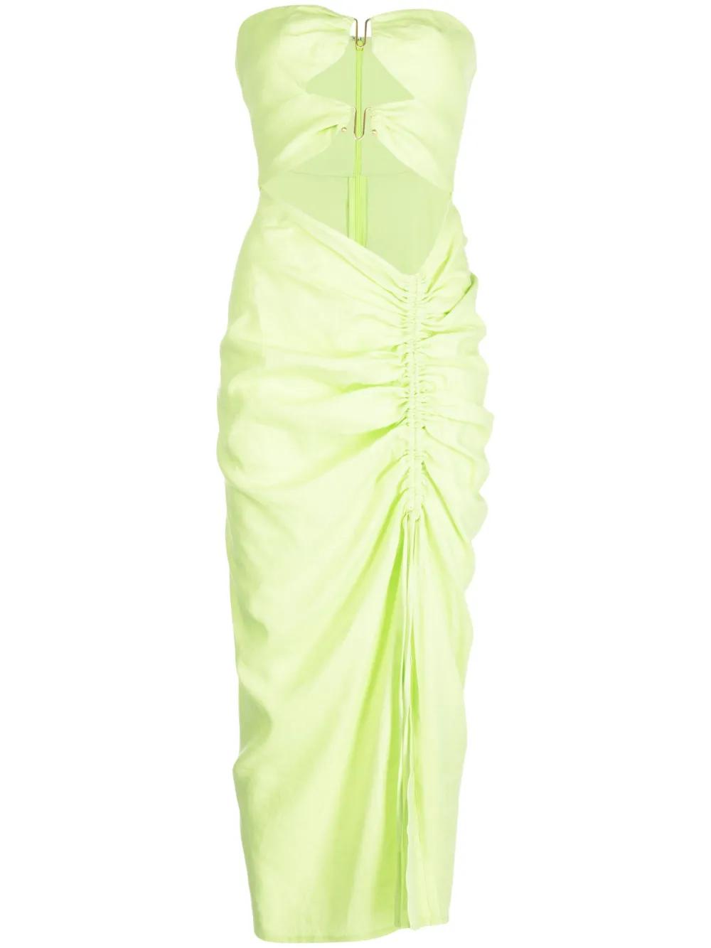lime green linen blend gold-tone hardware cut-out detailing ruched detailing bustier-style neckline front slit calf-length concealed rear zip fastening