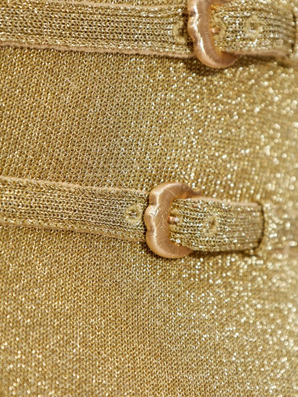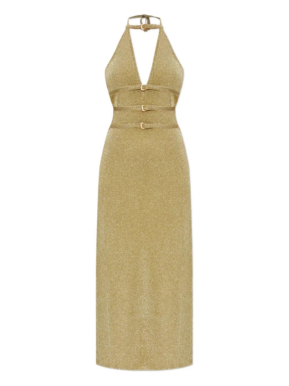 gold-tone halter neck three buckles open back fitted bodice midi length