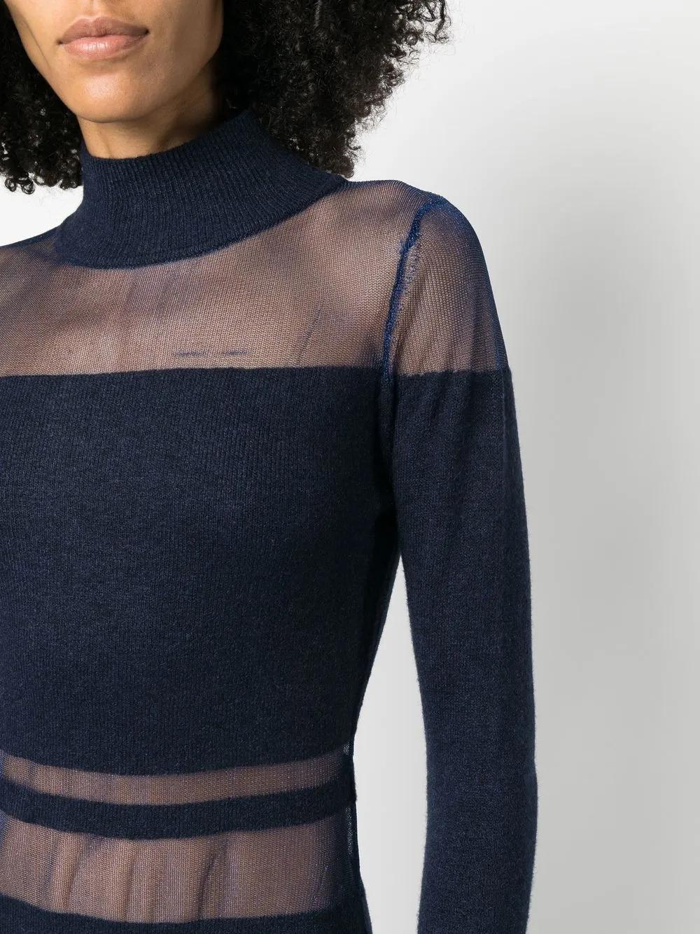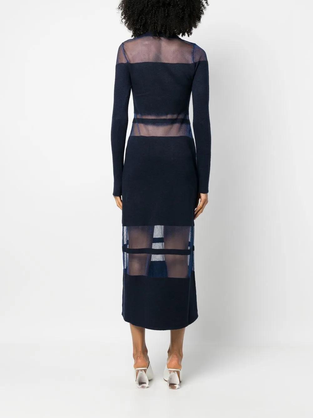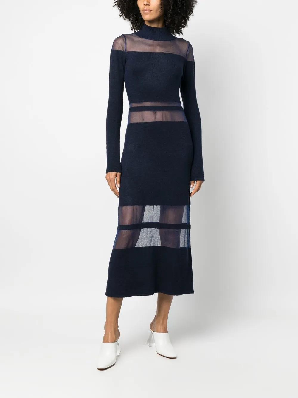 navy blue fine knit sheer panels high neck long sleeves maxi