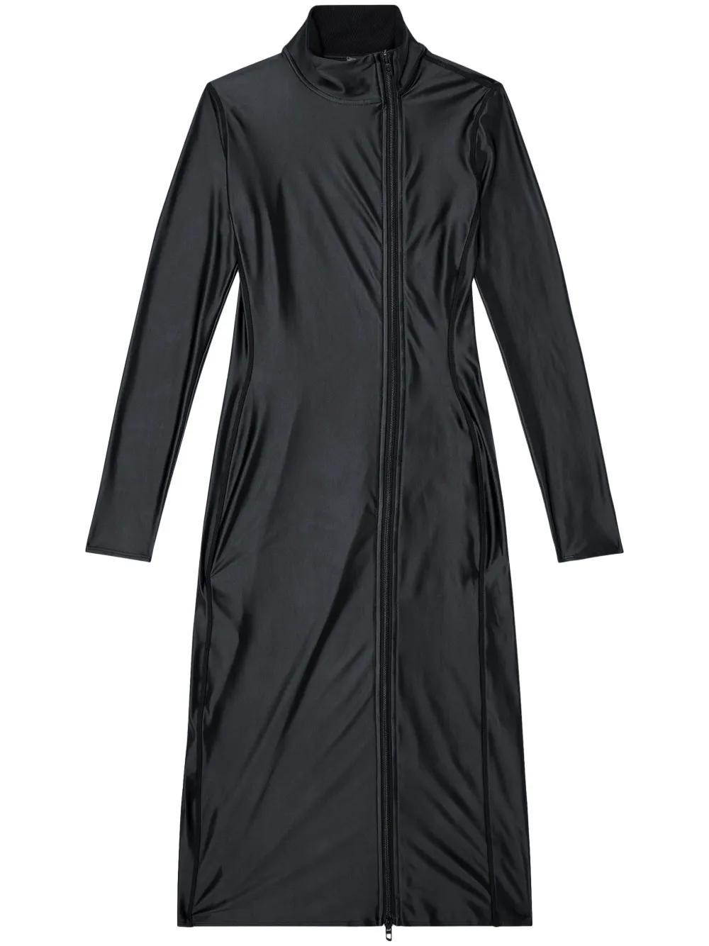 black stretch-design high-shine finish off-centre two-way zip fastening roll neck long sleeves fitted waistline A-line embroidered Oval D logo to the rear straight hem below-knee length
