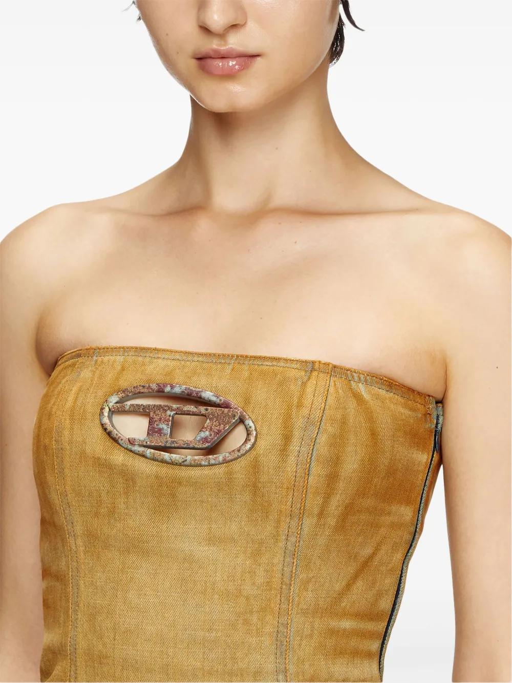 light brown cotton denim distressed effect whiskering effect panelled design Oval D logo plaque square neck strapless concealed side hook and zip fastening unlined straight hem mid-length