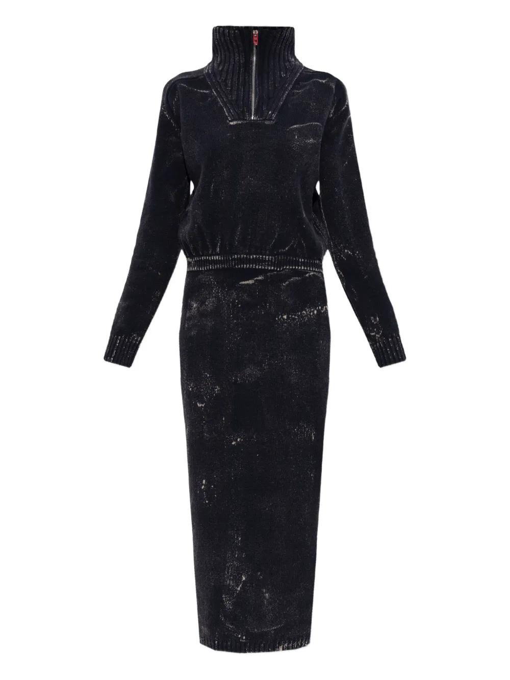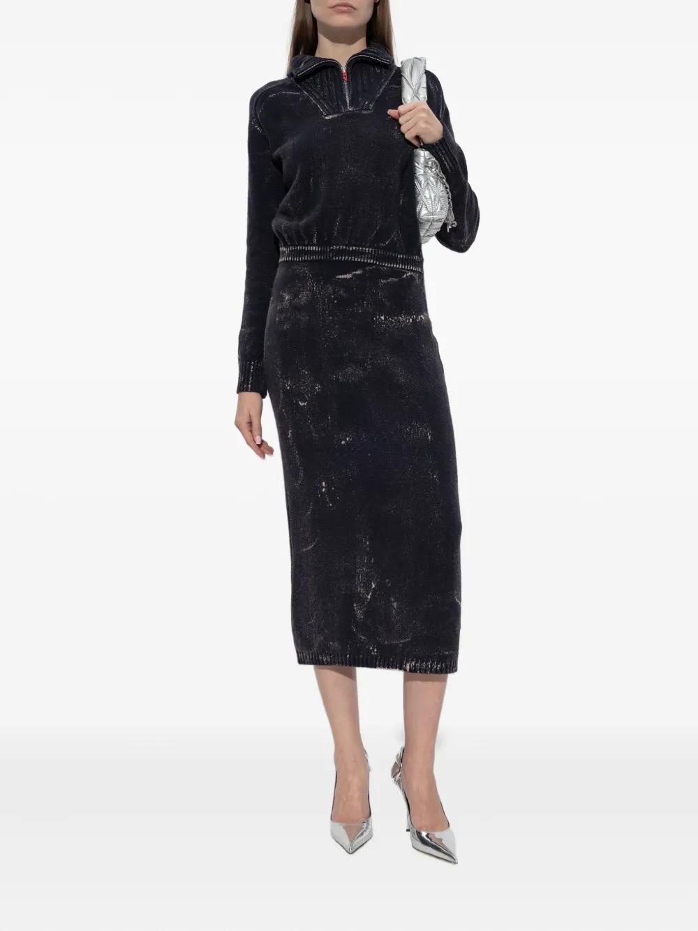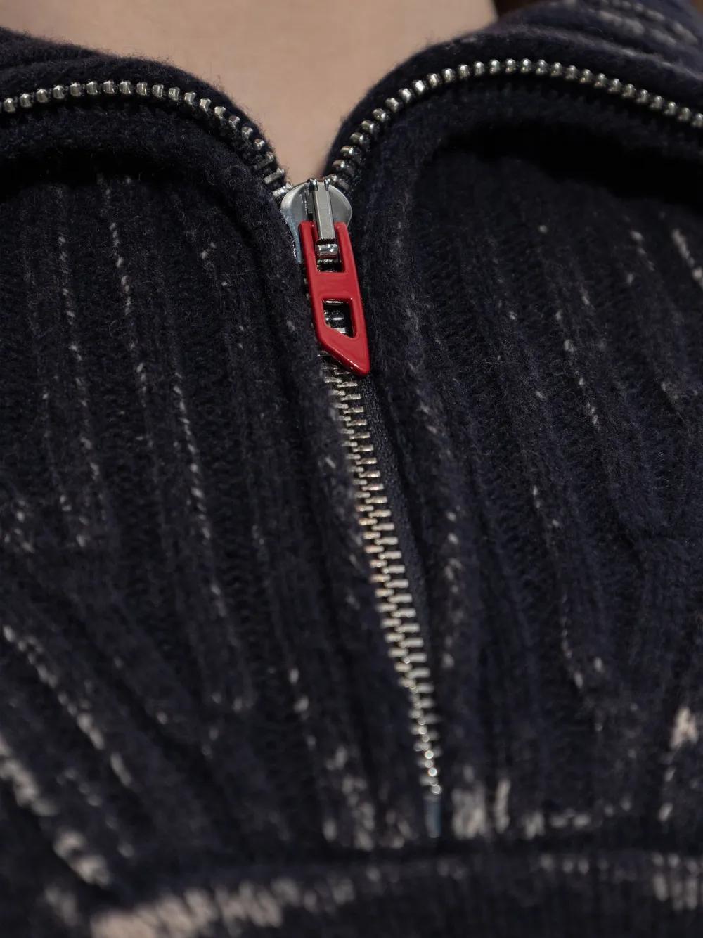 brown knitted zipped turtleneck blouson shape cinched waist red logo zip pull