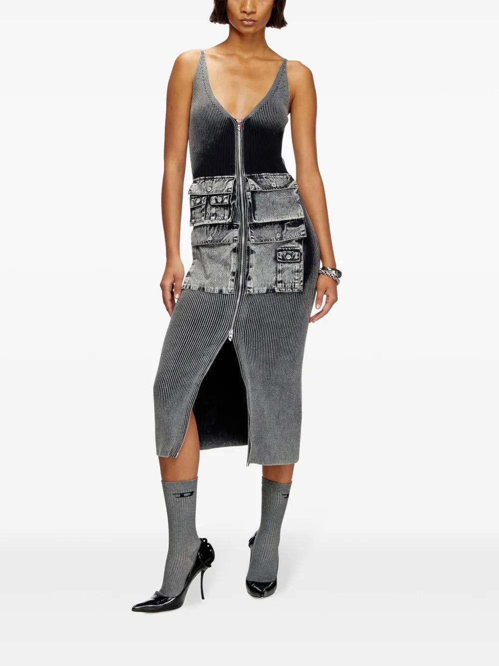 dark grey cotton fine ribbed front two-way zip fastening V-neck sleeveless denim patchwork design multiple patch pockets V-back unlined straight hem mid-length