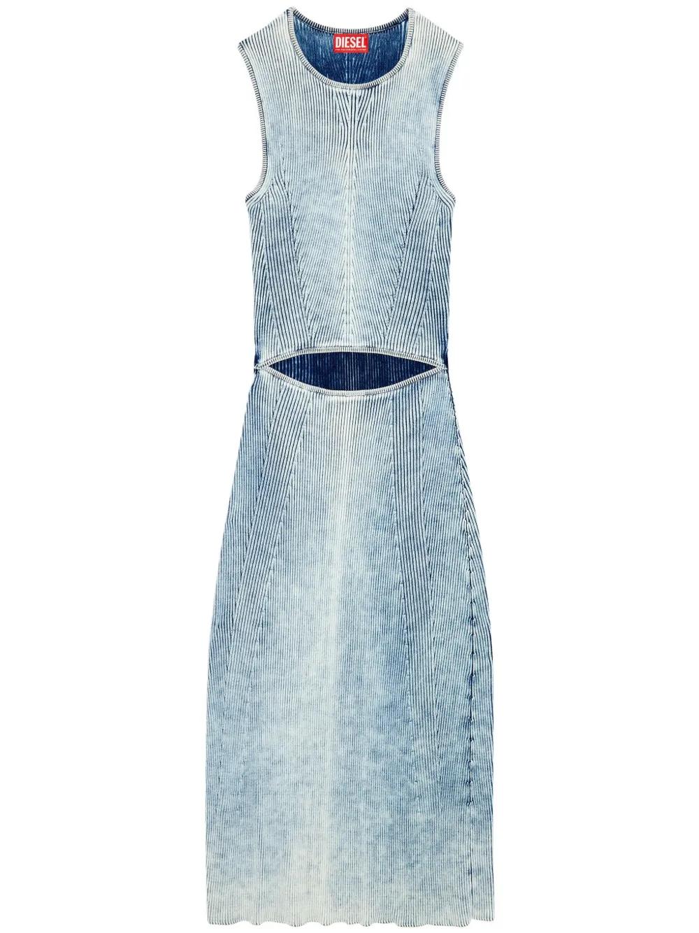 blue stretch-cotton ribbed knit round neck sleeveless cut-out detailing bodycon design calf-length straight hem