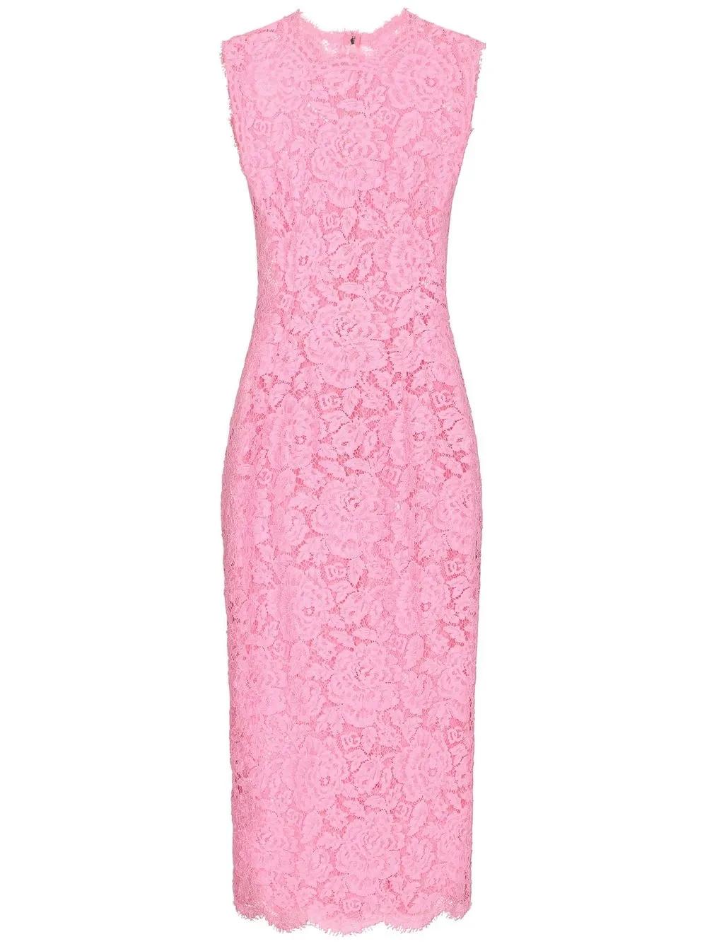 light pink stretch-design lace trim semi-sheer construction round neck short sleeves concealed rear zip fastening scallop hem mid-length