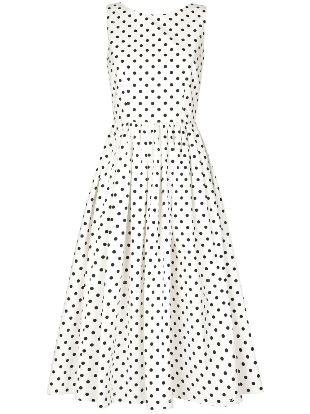 white/black cotton polka dot print boat neck concealed rear zip fastening sleeveless mid-length