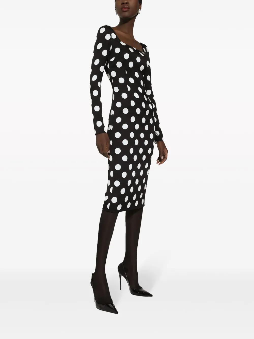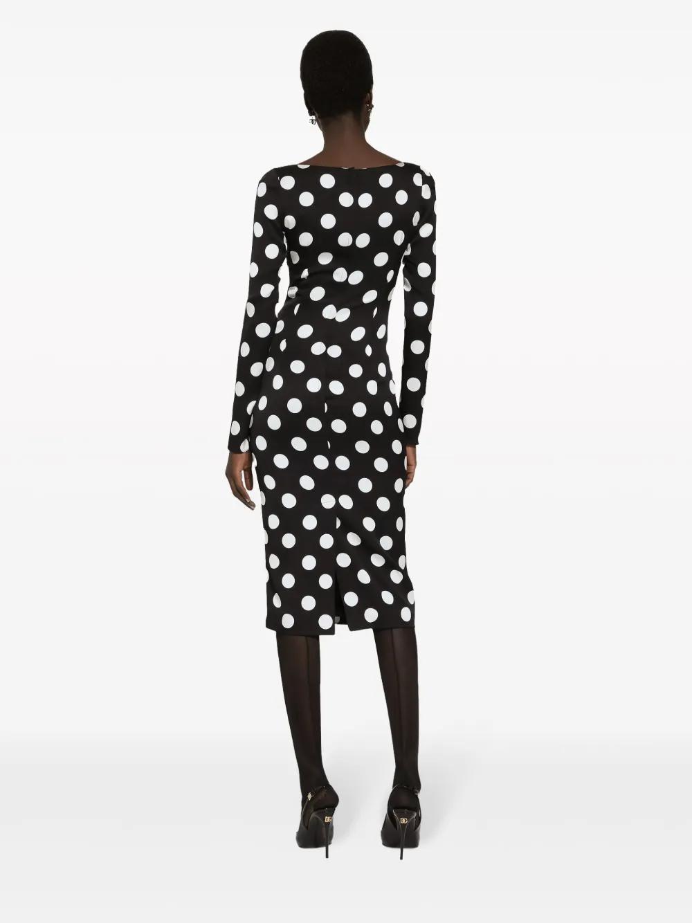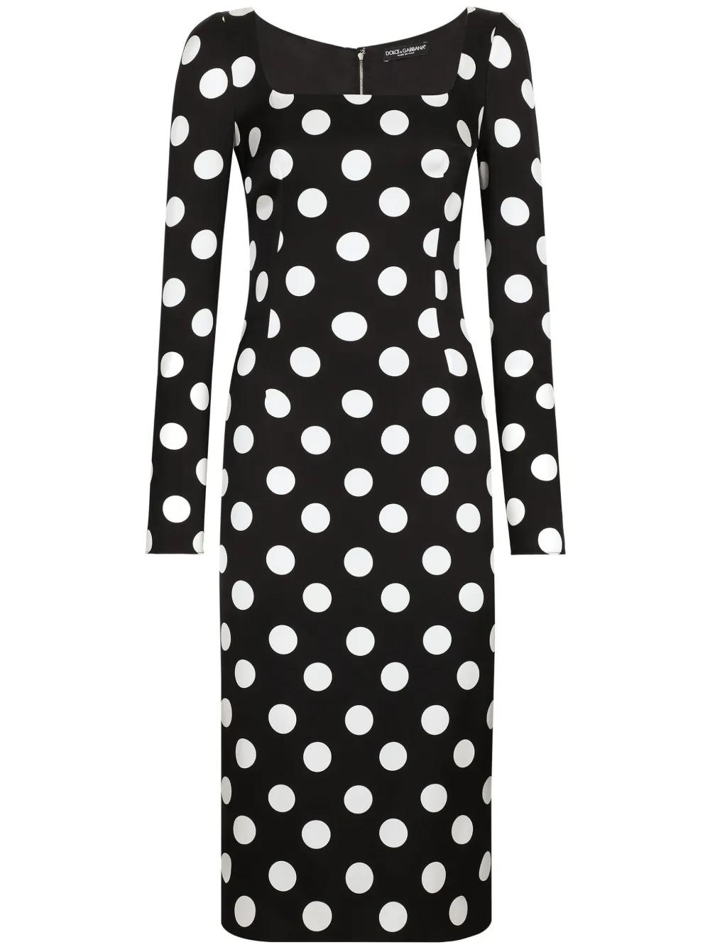 black/white stretch-silk charmeuse polka dot print sheath silhouette square neck long sleeves straight hem rear slit below-knee length