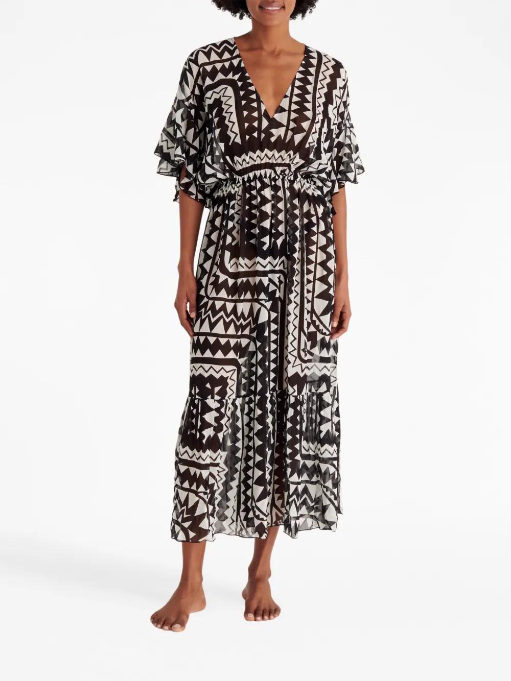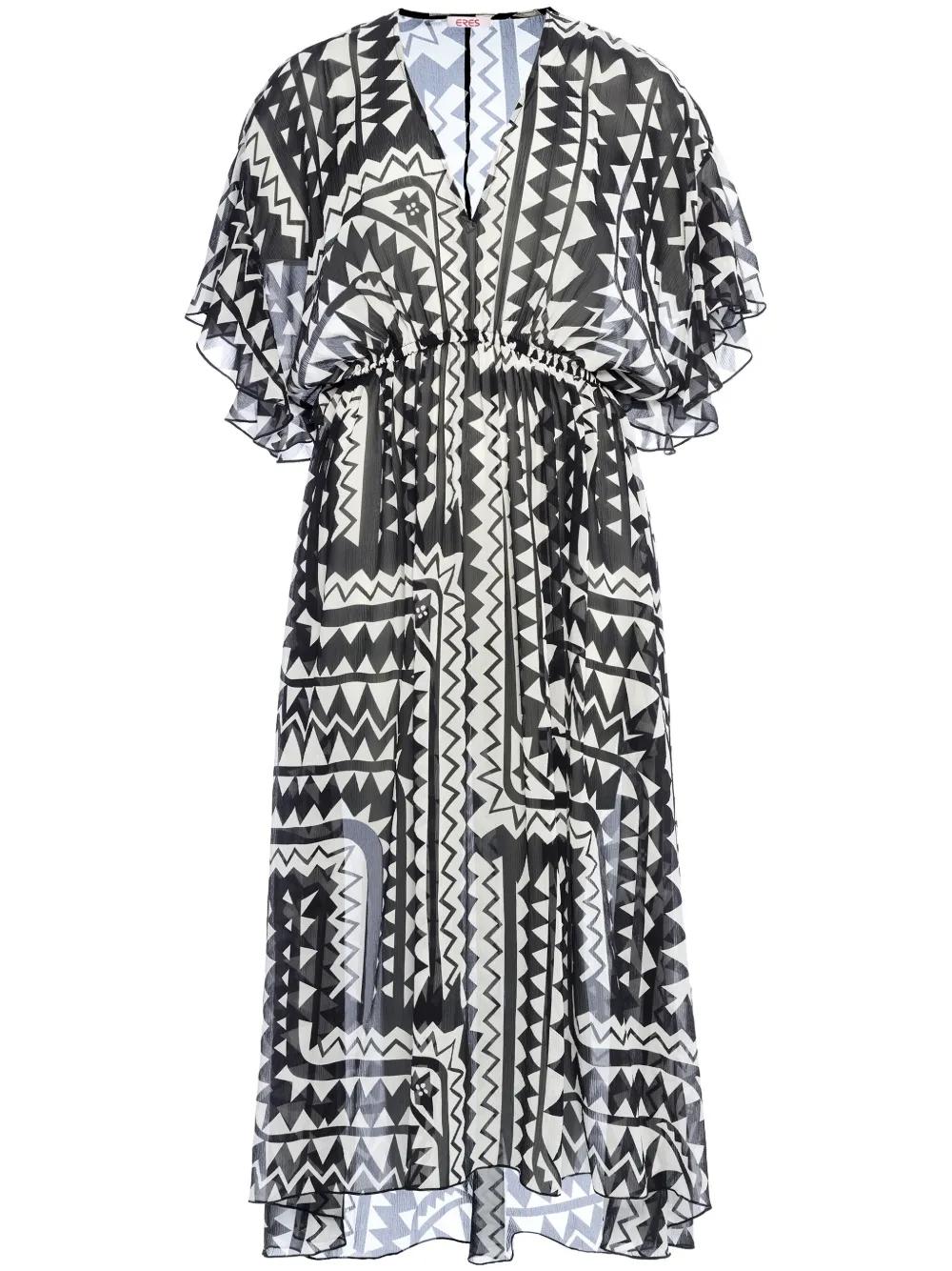 white/black silk geometric print V-neck short draped sleeves elasticated waistband calf-length