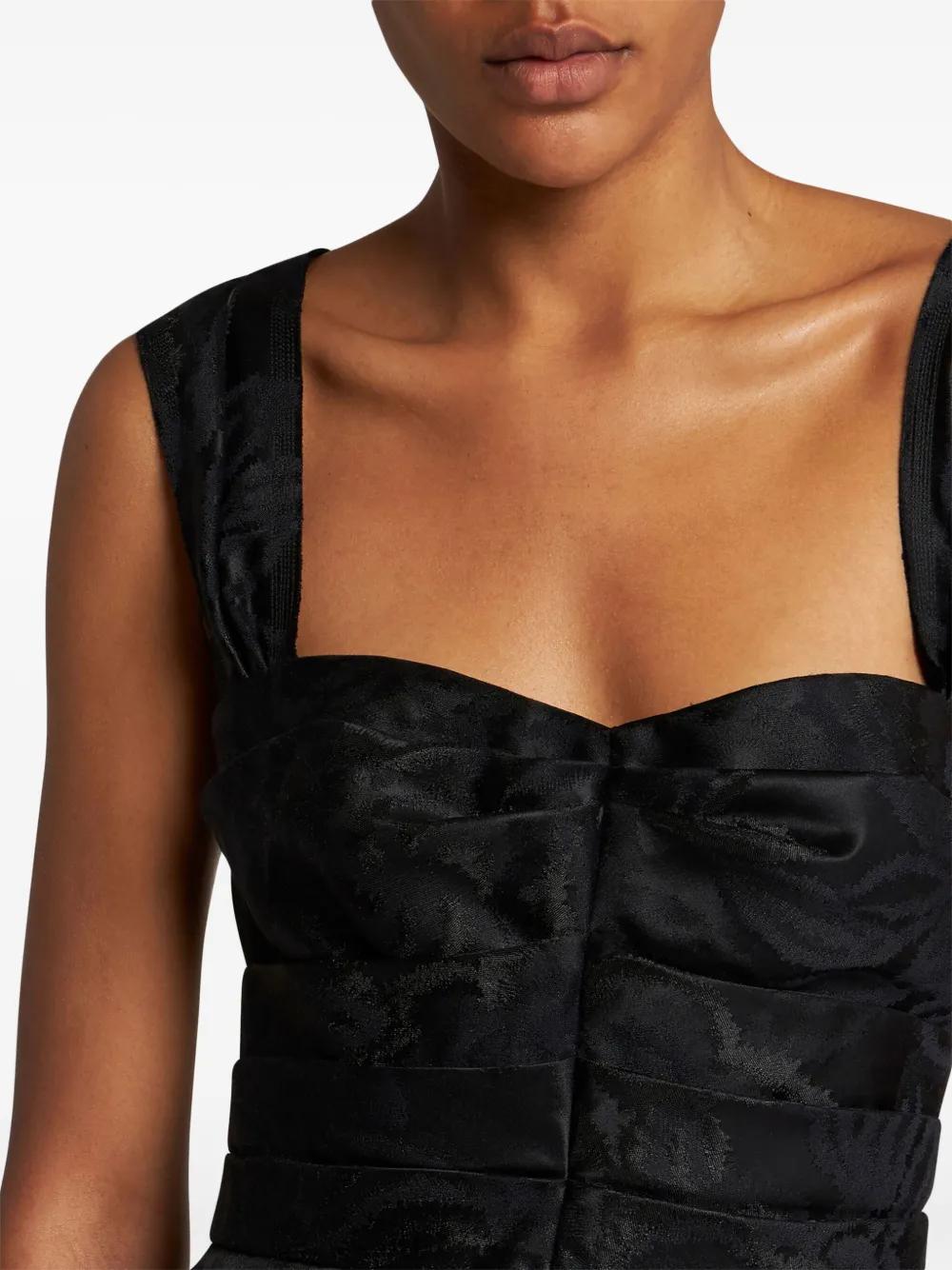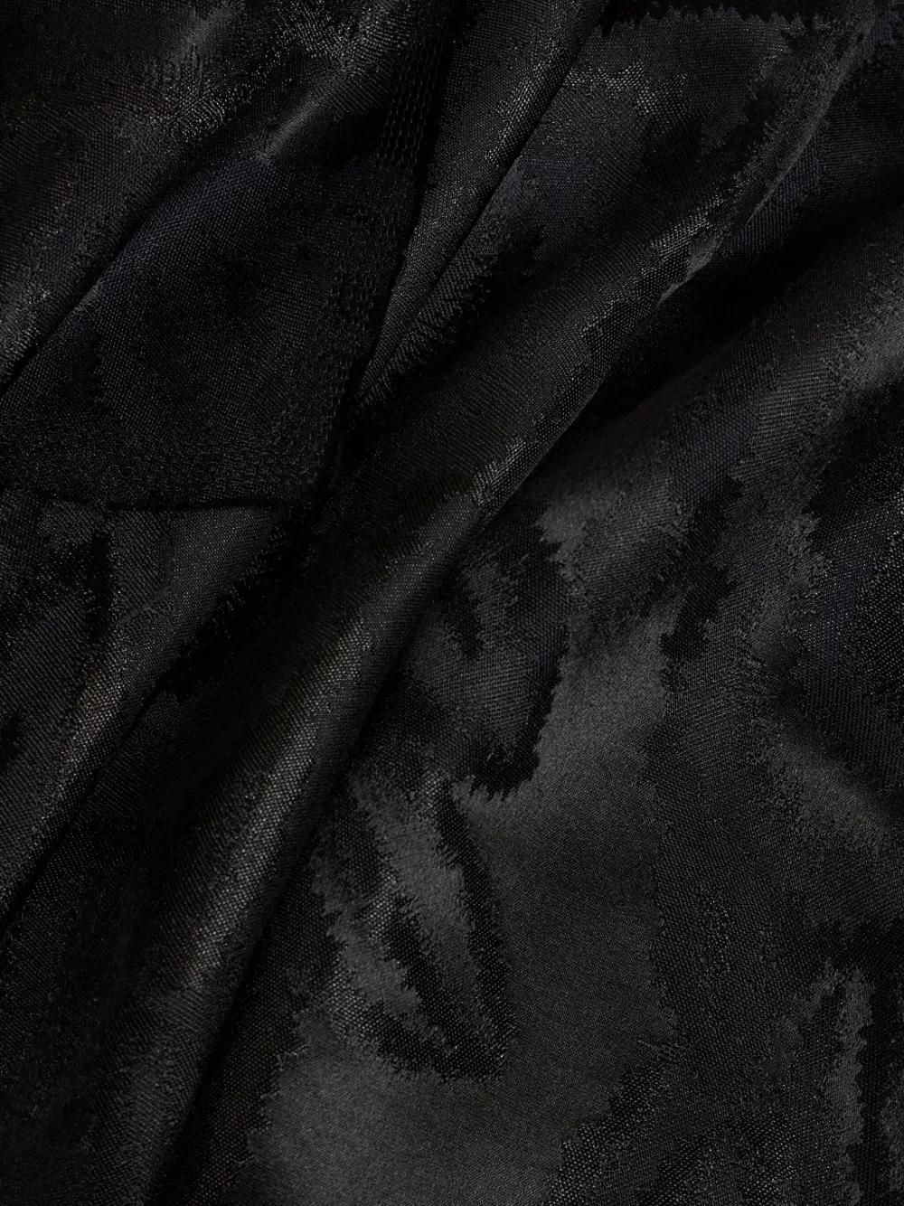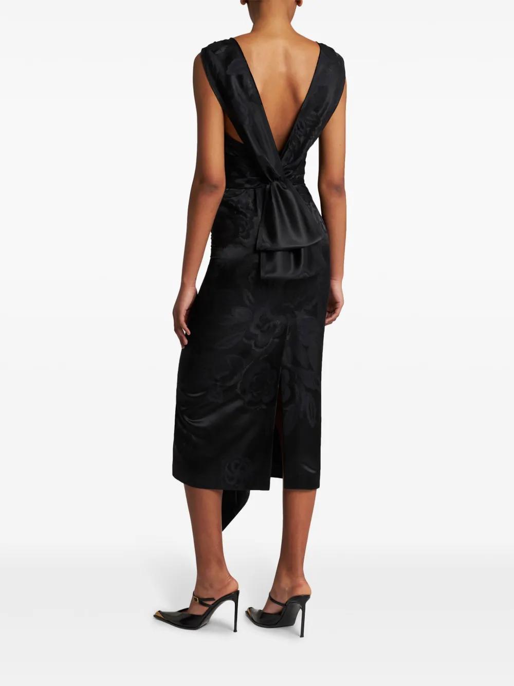 black silk blend floral jacquard rear tie fastening detail rear zip fastening two flat shoulder straps sweetheart neck draped detailing central rear vent straight hem calf-length