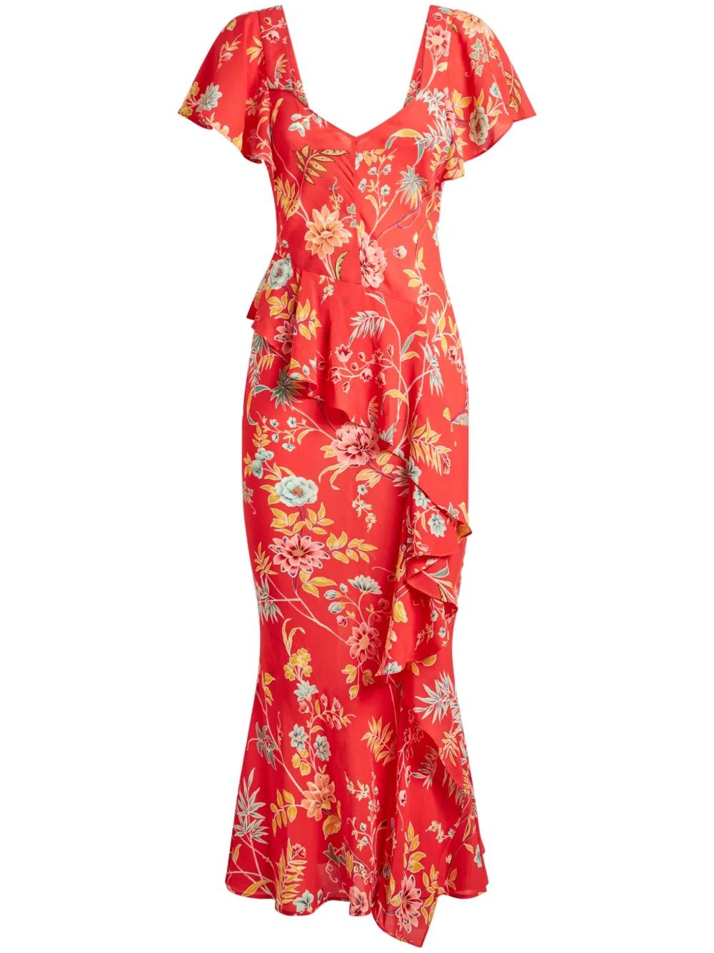 red multicolour crepe texture all-over floral print concealed rear hook and zip fastening V-neck ruffled detailing short sleeves ruffled trim flared hem