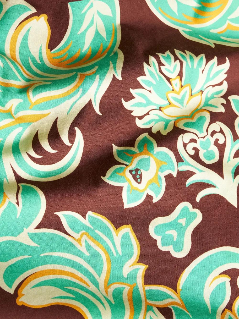 mint green/chestnut brown/mustard yellow cotton all-over floral print signature Pegaso motif camp collar front button fastening short sleeves belted waist flared skirt straight hem mid-length
