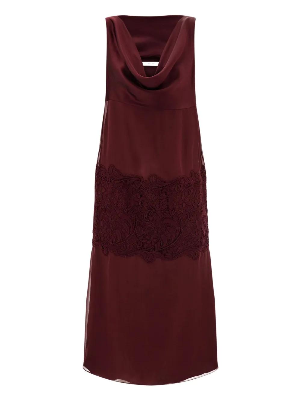 burgundy cowl neckline sleeveless silk chiffon lace insert straight-line skirt