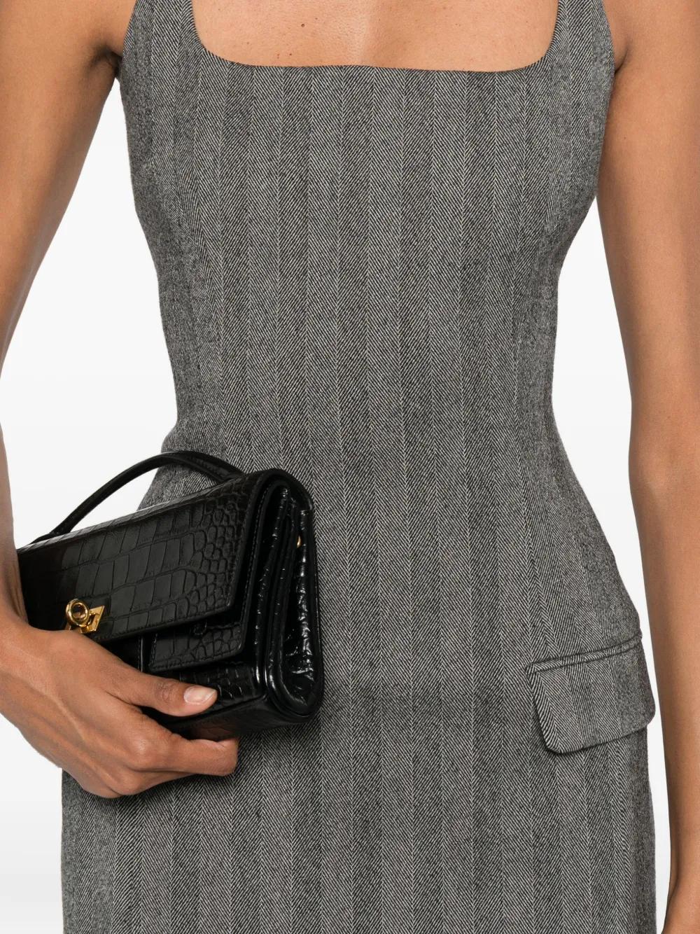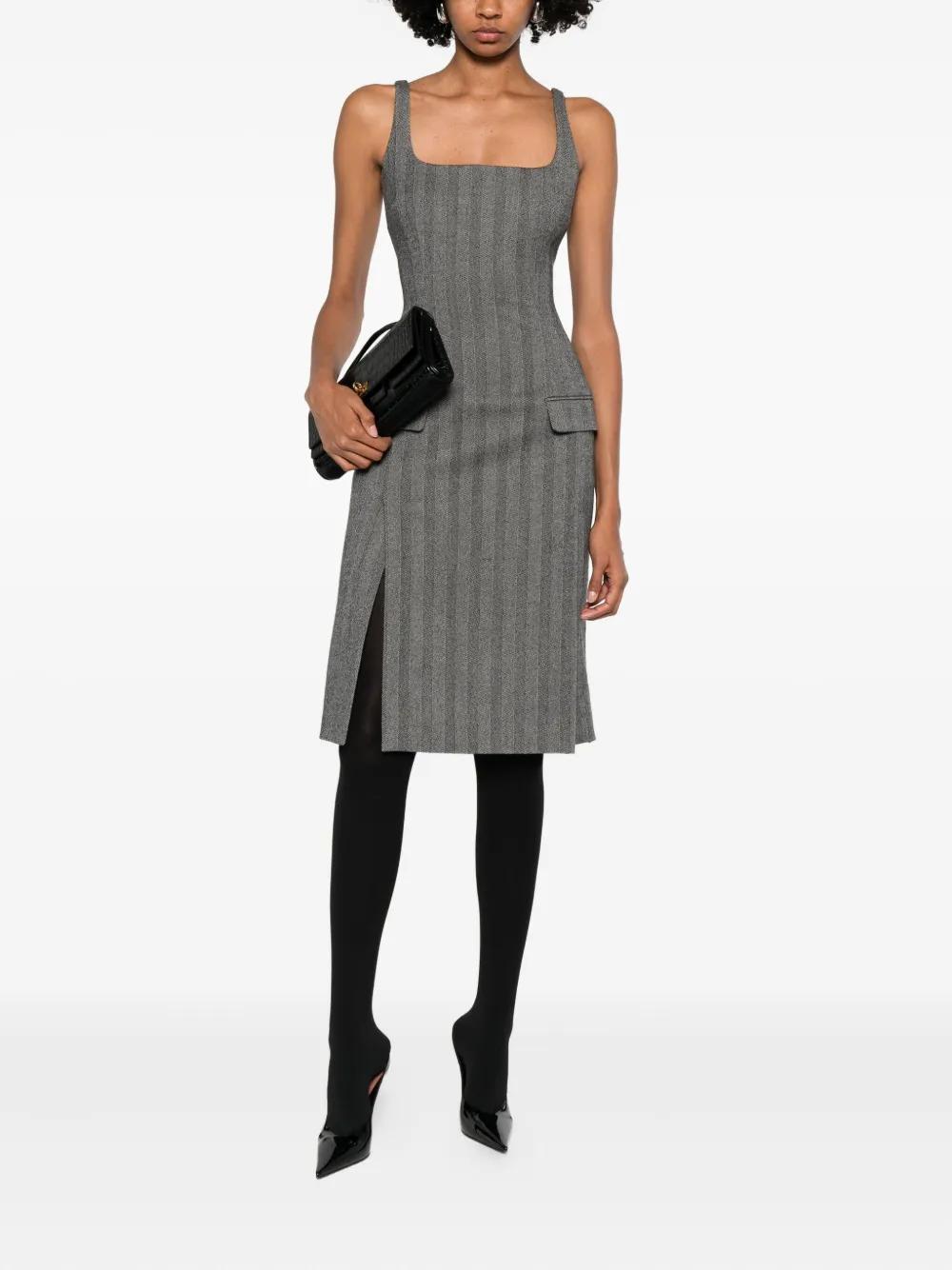 grey pleated detailing square neck two front flap pockets sleeveless vertical stripe pattern