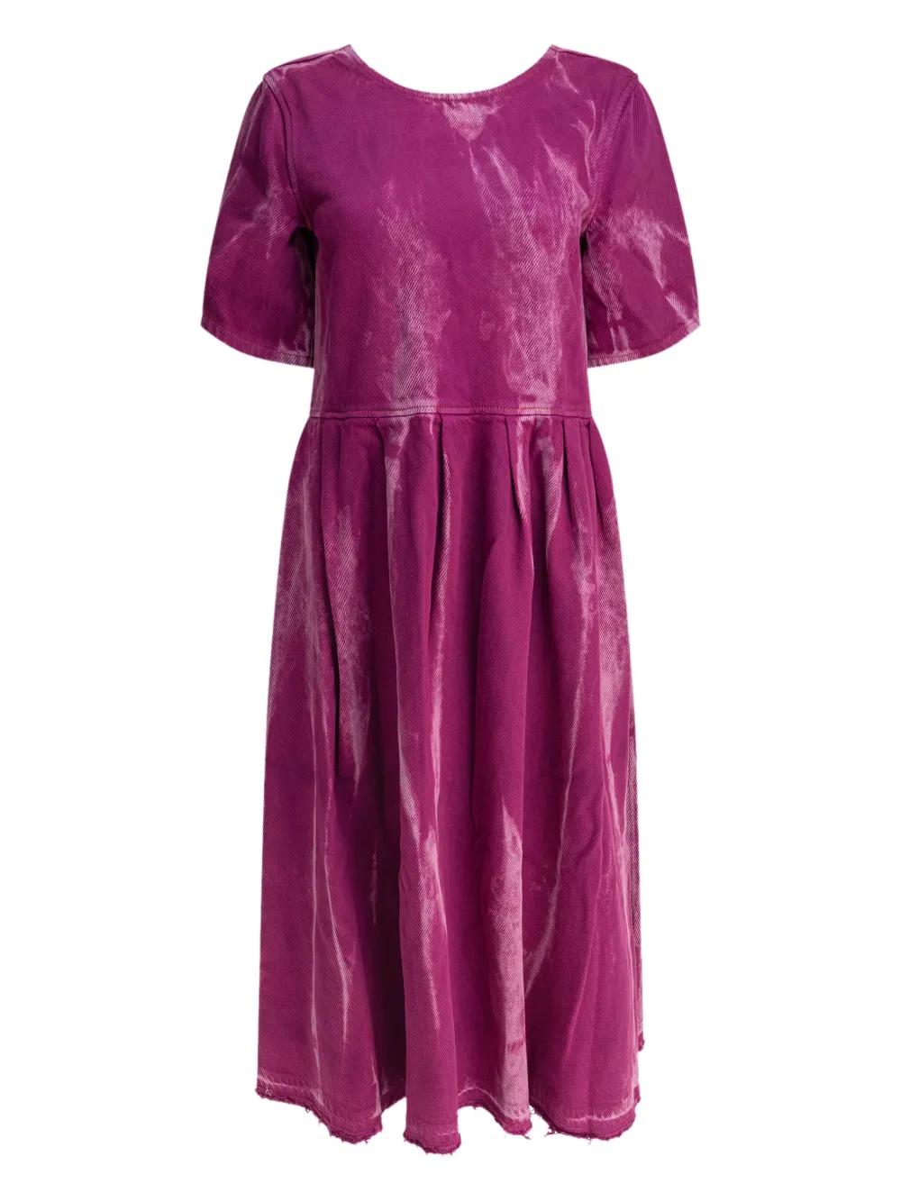 pink acid wash effect pleated skirt short sleeves round neck buckle fastening