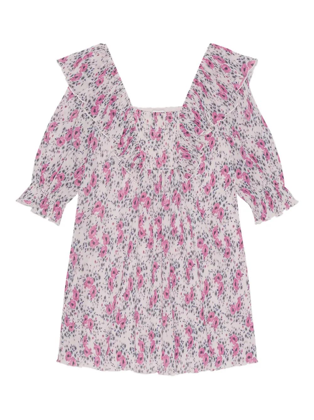 white pink floral print pleated bodice ruffled neckline short sleeves gathered waist