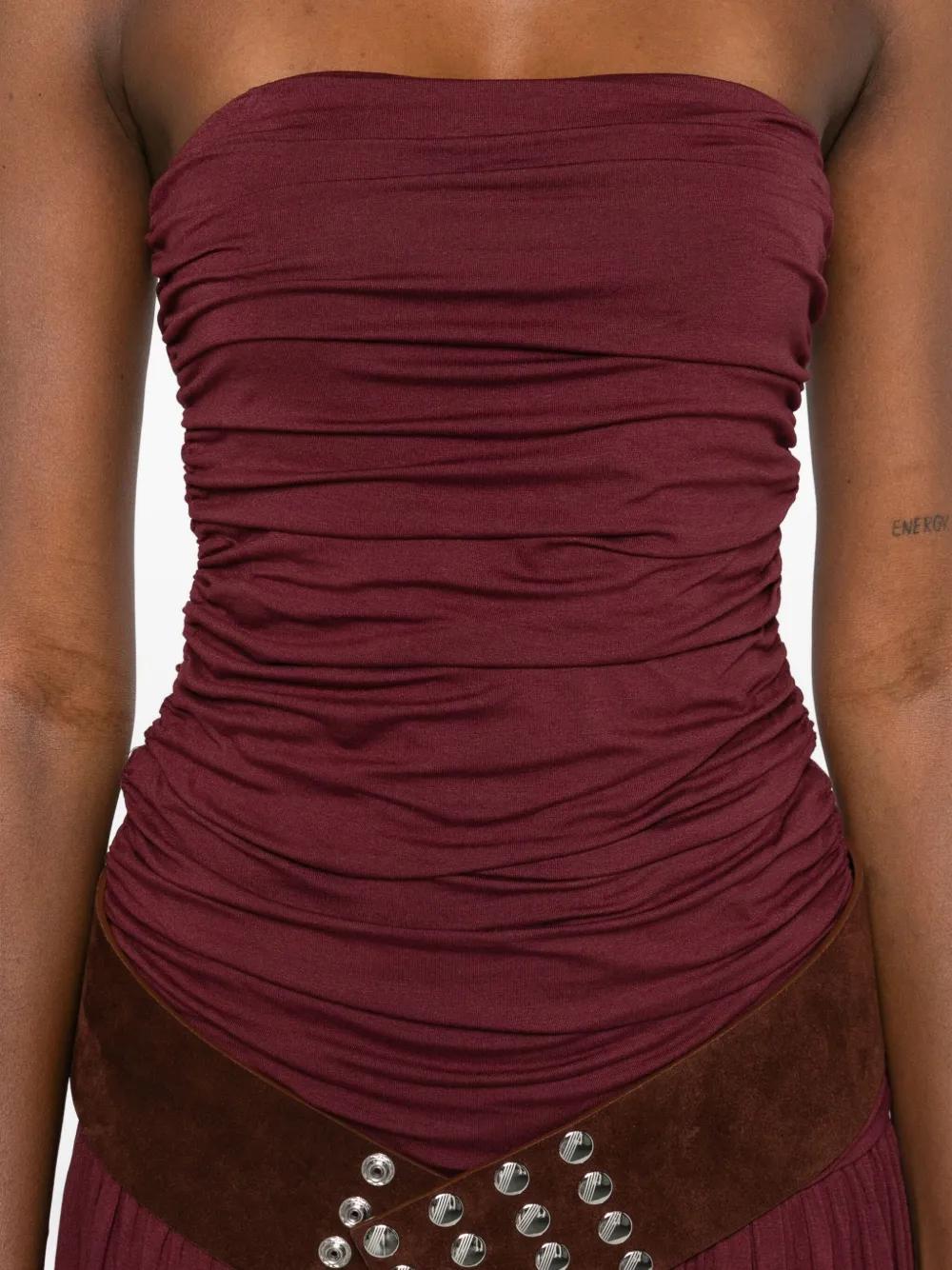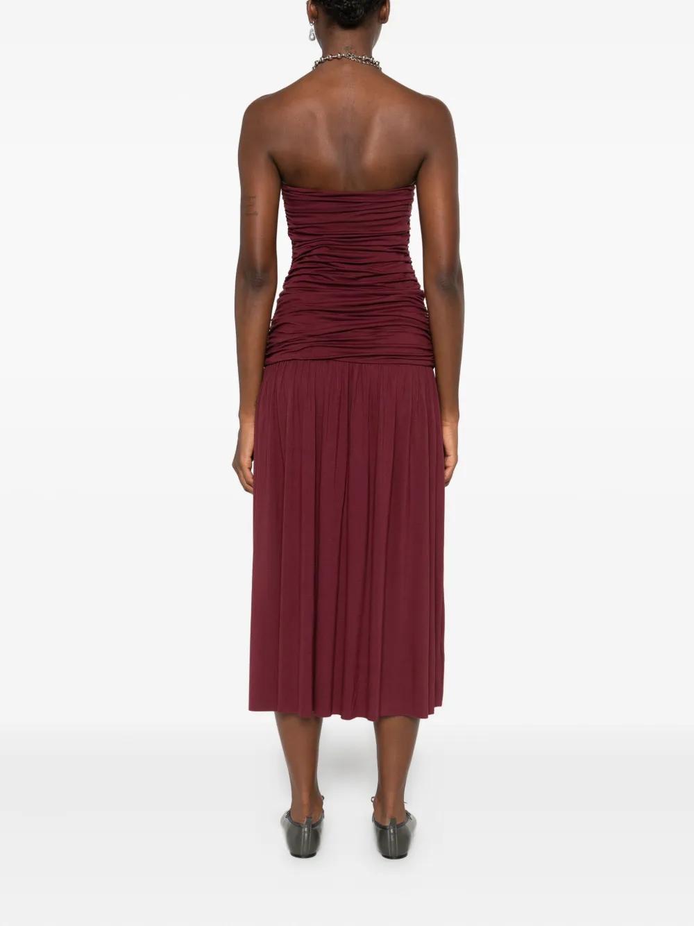 burgundy strapless neckline gathered bodice empire waistline midi length