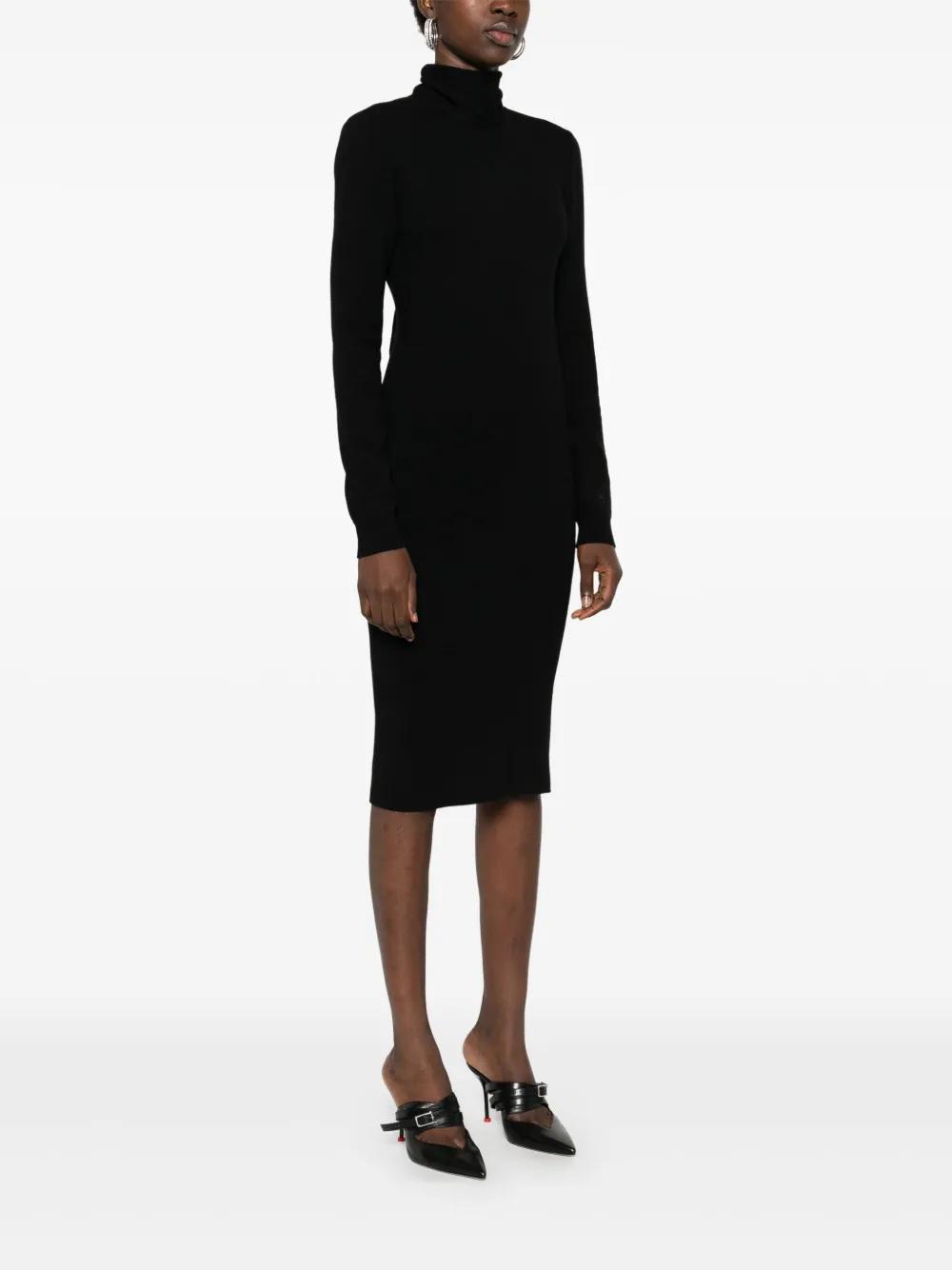 black knitted construction rear tie fastening side zip fastening high neck long sleeves ribbed cuffs open back unlined straight hem knee-length
