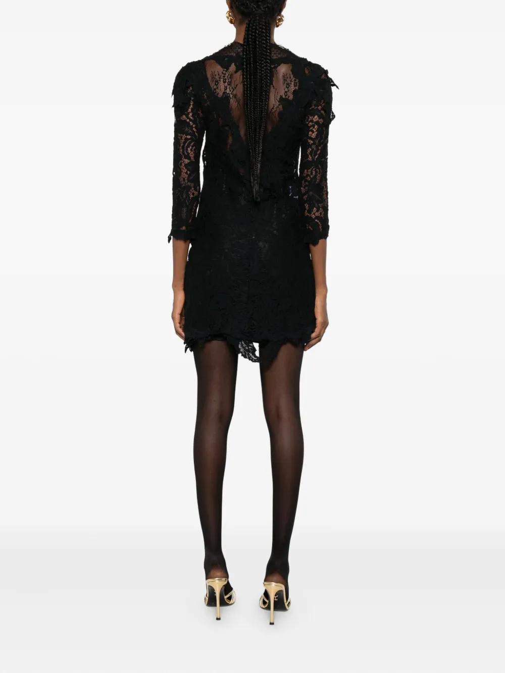 black floral lace ruffled detail three-quarter sleeves scalloped hem round neck