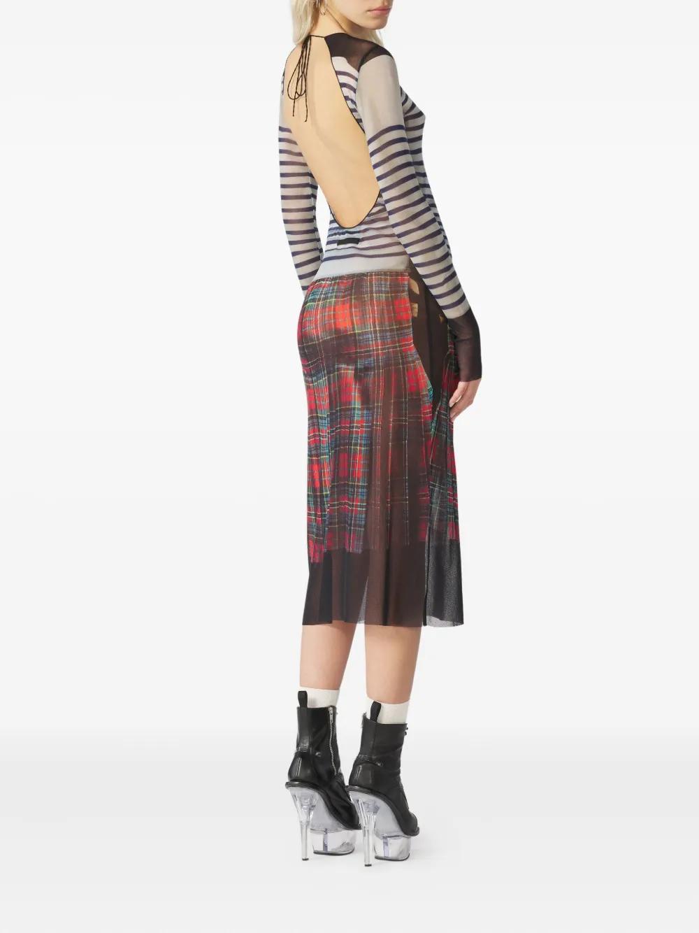white, blue, red and black striped design crew neck long sleeves open back kilt print