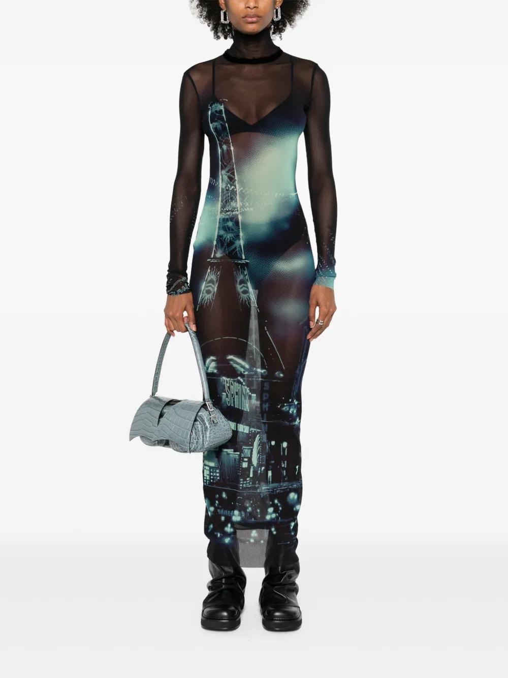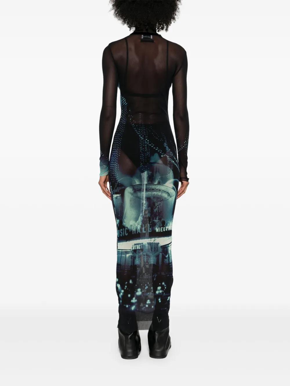 black/multicolour mesh design stretch-design semi-sheer construction abstract pattern print logo and slogan print velvet trim stand-up collar long sleeves unlined straight hem pull-on style