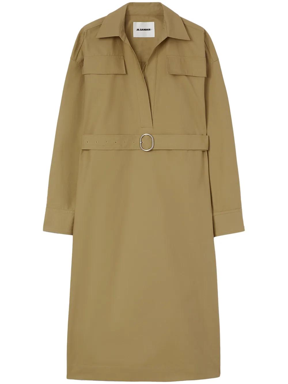 beige cotton classic collar belted waist two chest flap pockets two side slit pockets long sleeves straight hem mid-length