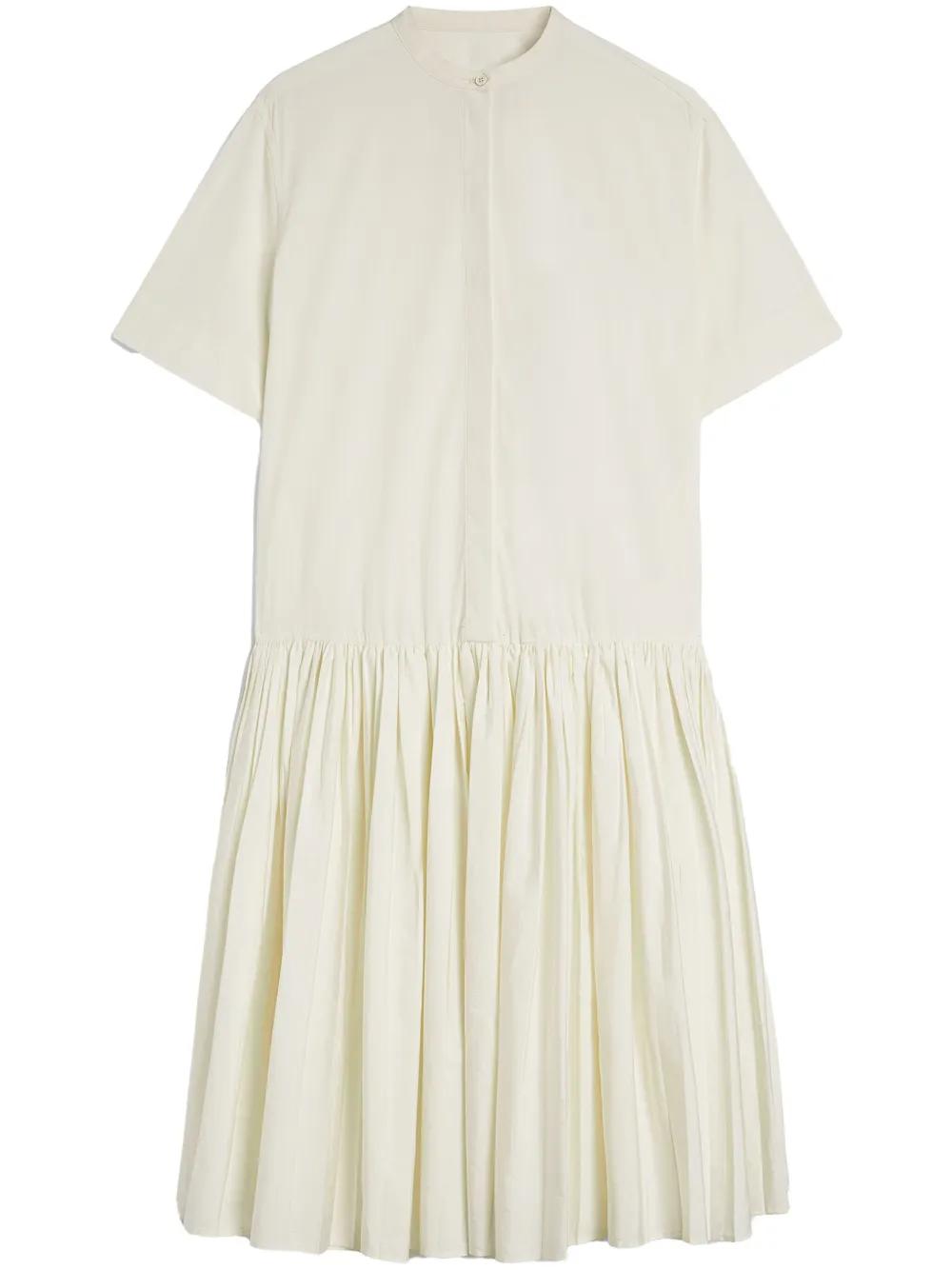 light beige cotton poplin texture front button fastening collarless round neck drop shoulder short sleeves pleated skirt straight hem mid-calf length