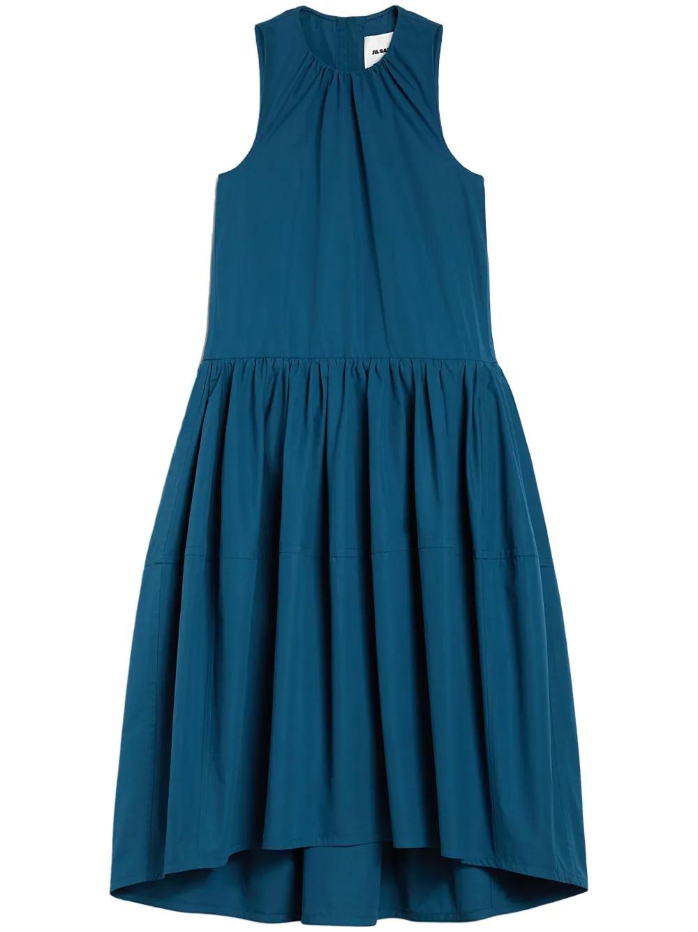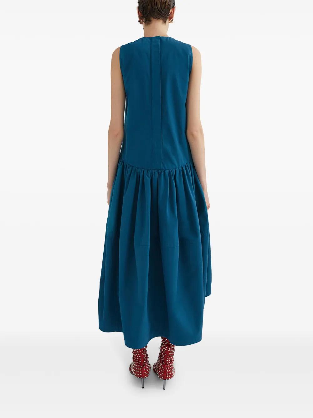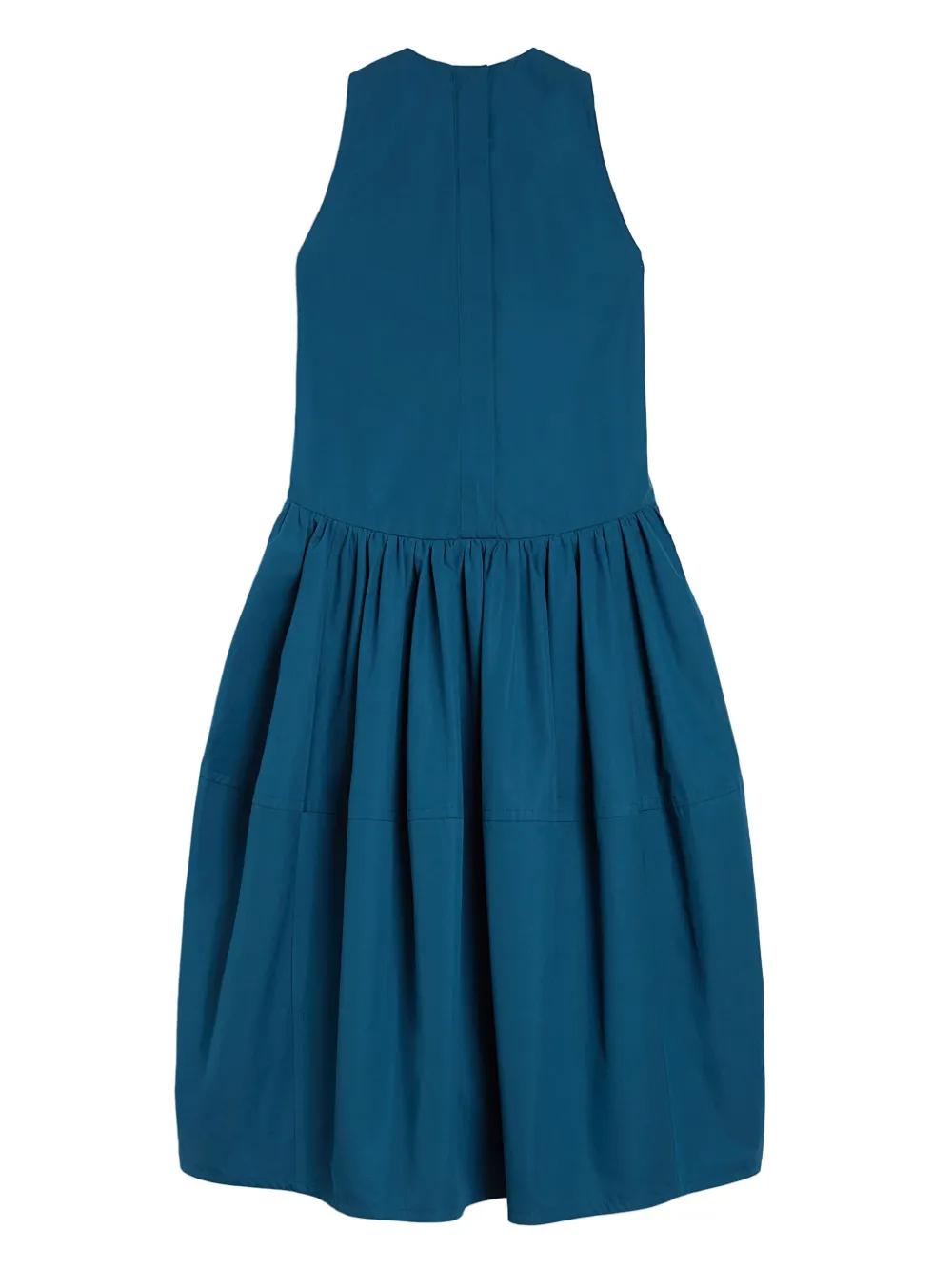 cobalt blue cotton concealed rear zip fastening round neck pleat detailing sleeveless A-line skirt high-low hem mid-length