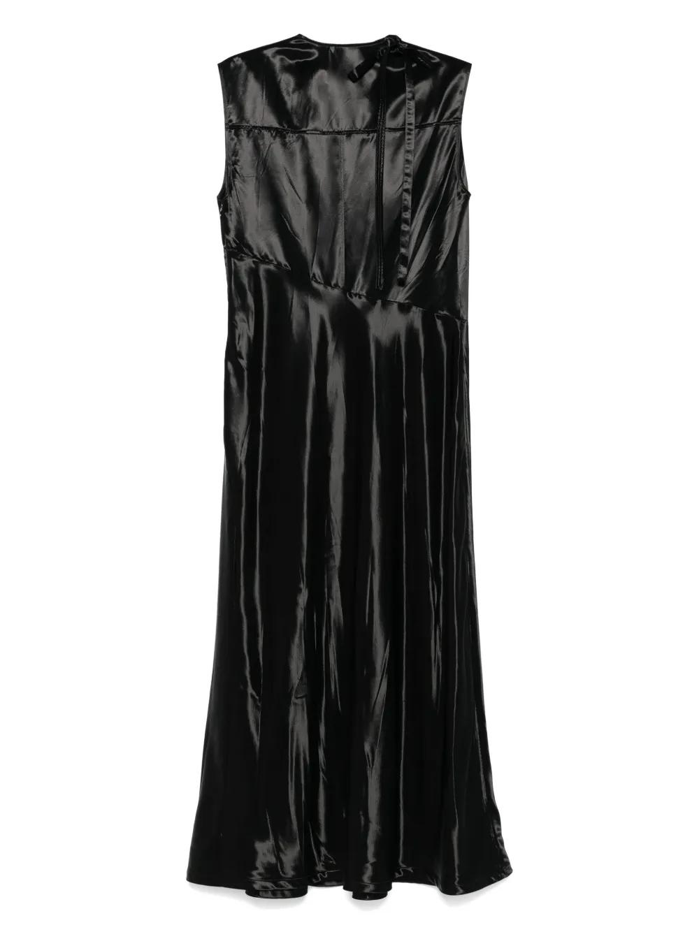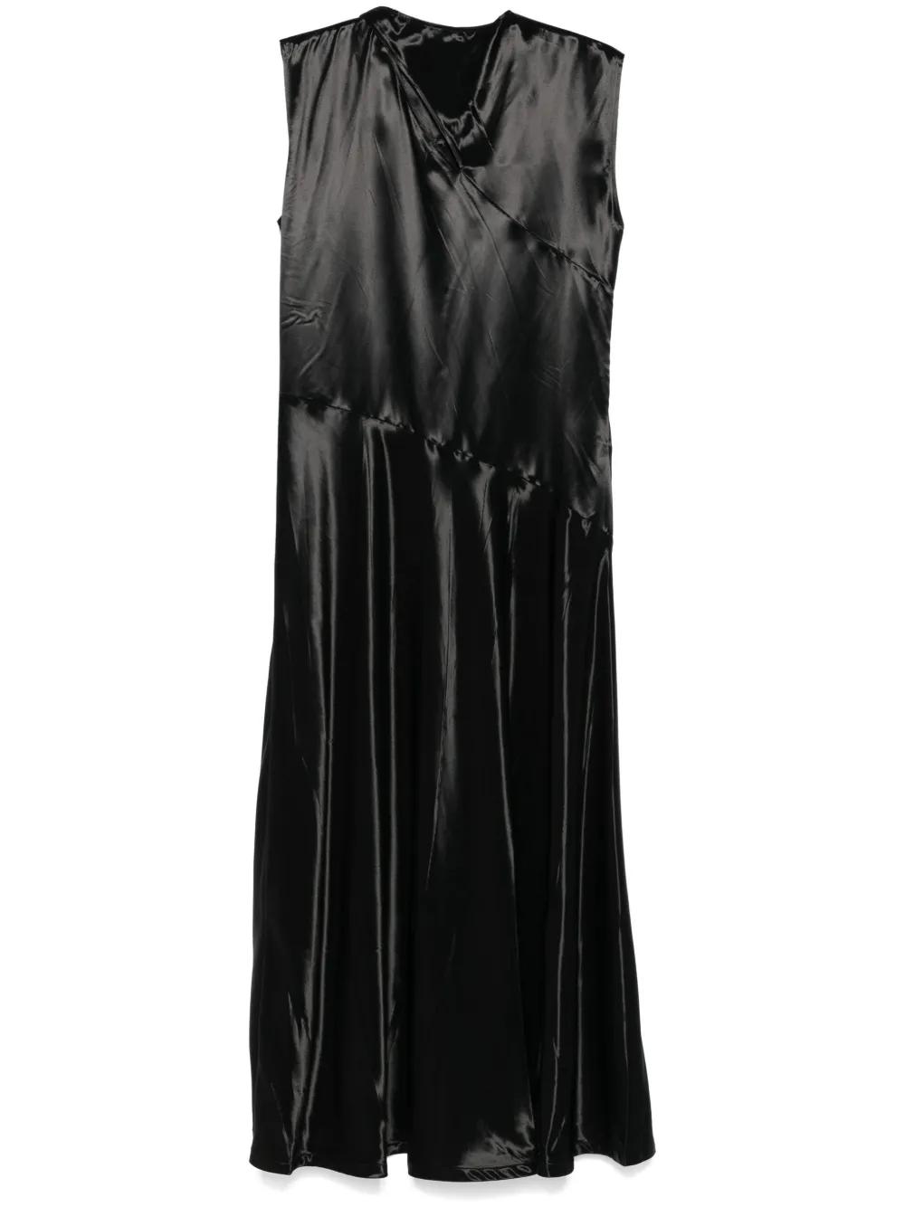 black satin weave concealed side zip fastening asymmetric neck sleeveless full lining flared hem mid-length