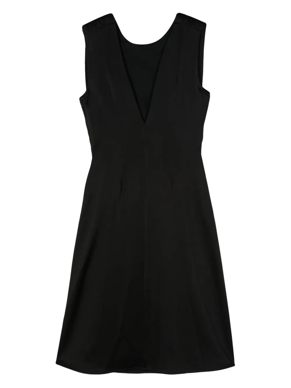 black crepe de chine gathered detailing empire line round neck sleeveless V-back mid-length unlined concealed side zip fastening