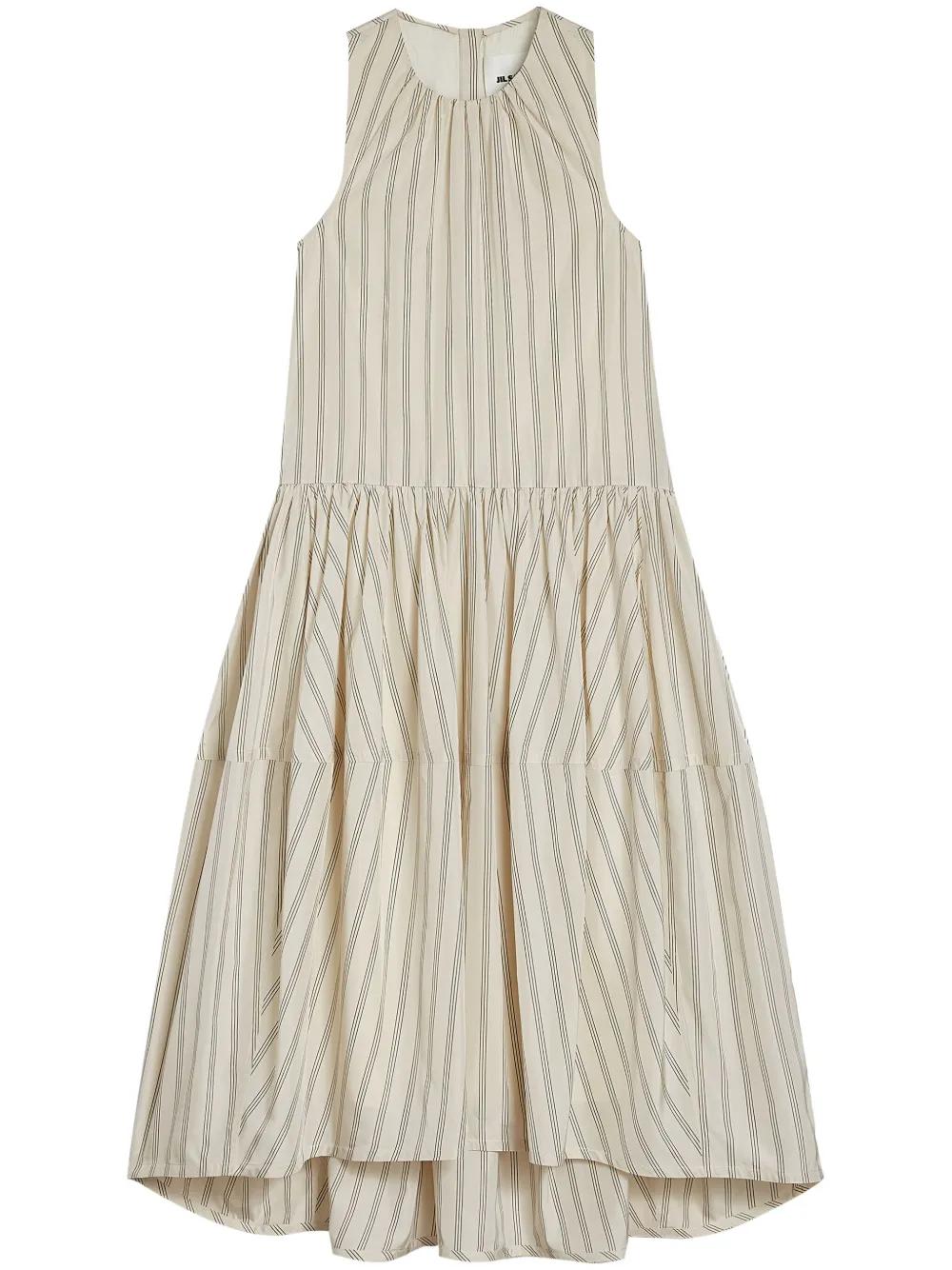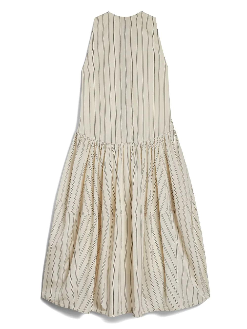 archive beige vertical stripe pattern concealed rear zip fastening round neck sleeveless two side inset pockets pleat detailing high-low hem mid-length