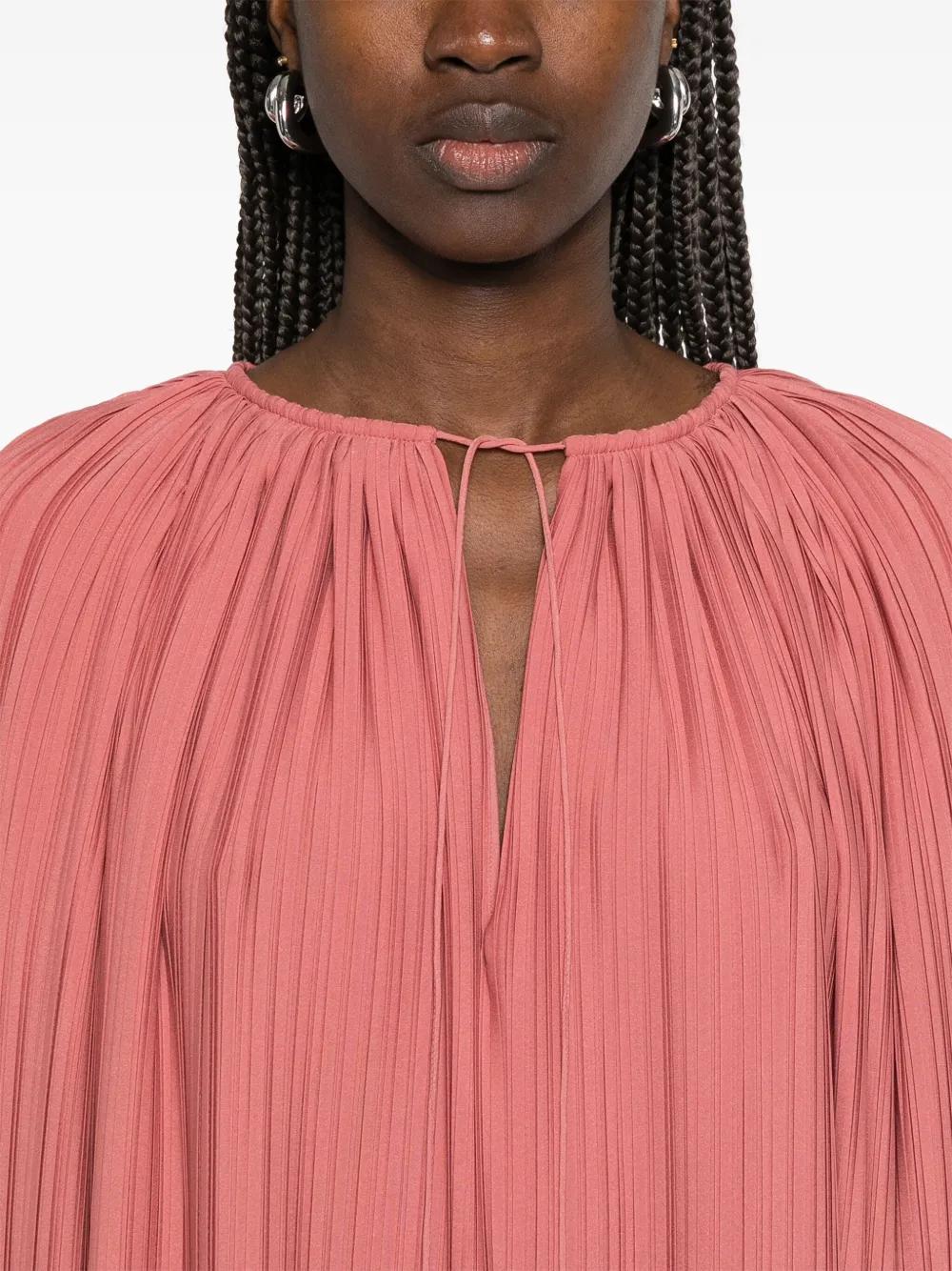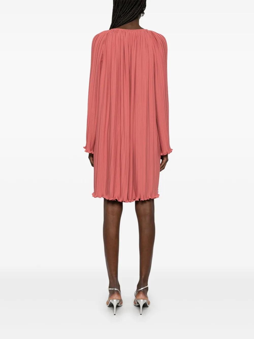 Dress woman in rose-pink polyester, round neck, long sleeves, pleated design, wavy hem detail, 100% polyester, Made in Slovakia, model is 180 cm and wears size 40100% polyester