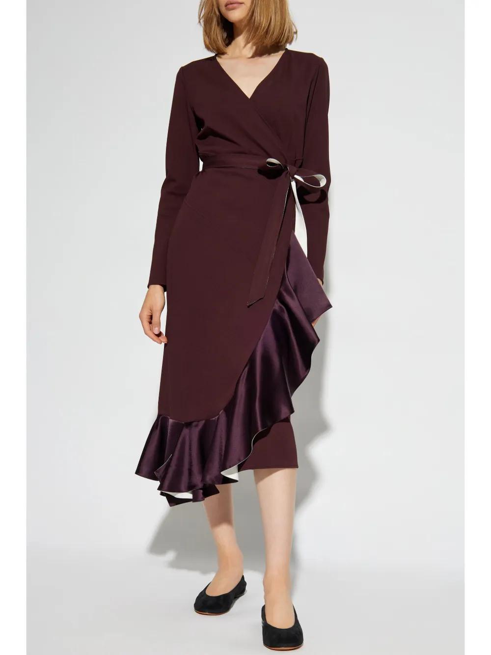 burgundy stretch-design wraparound style V-neck tied waist ruffled detailing long sleeves mid-length