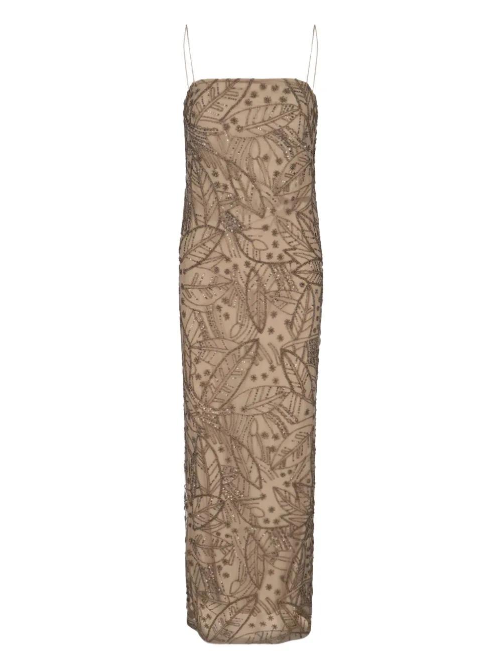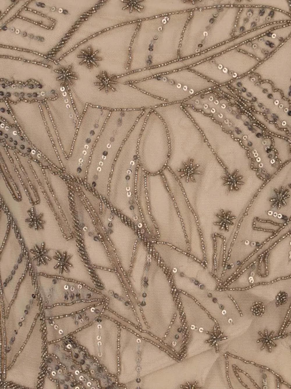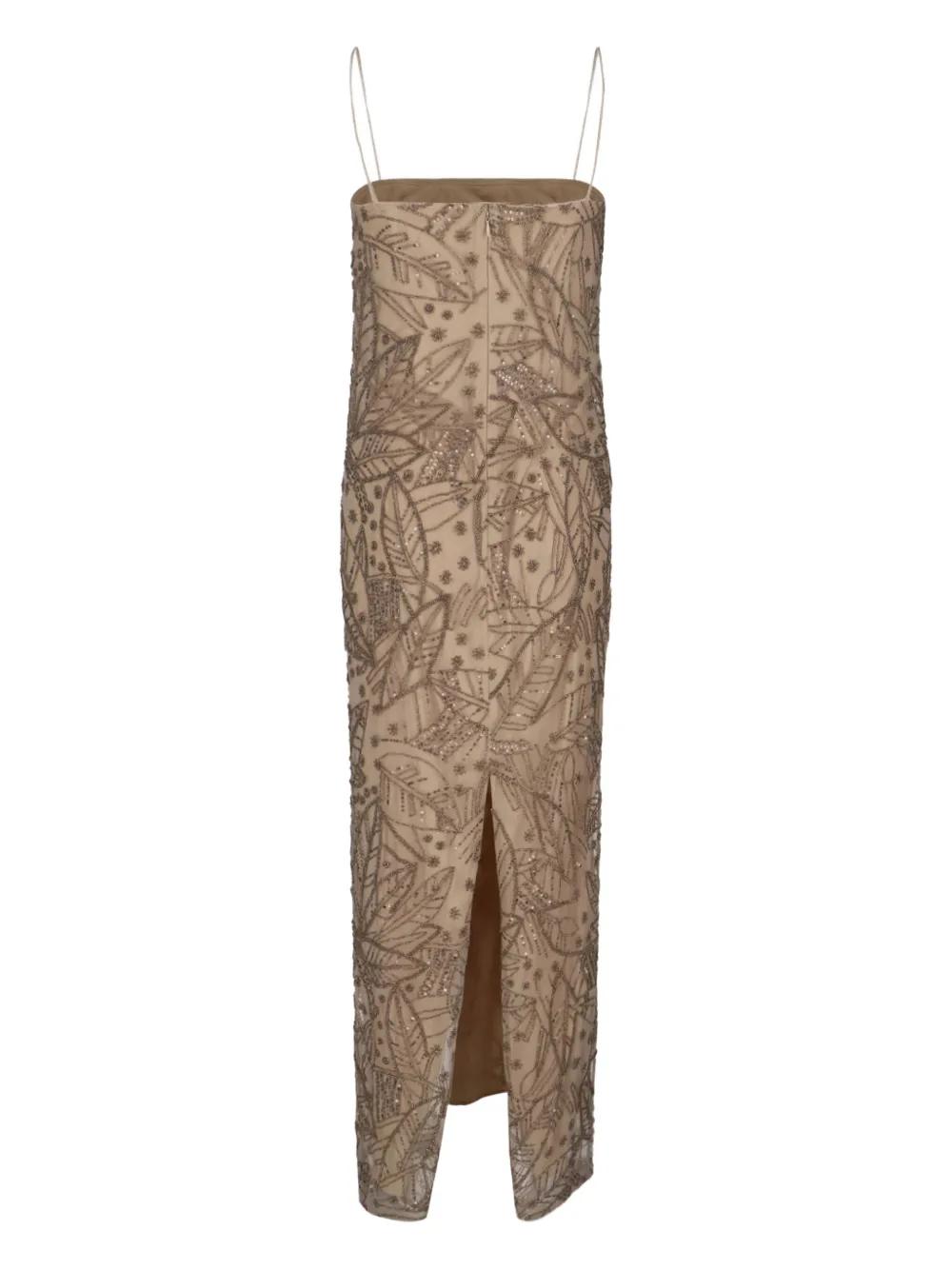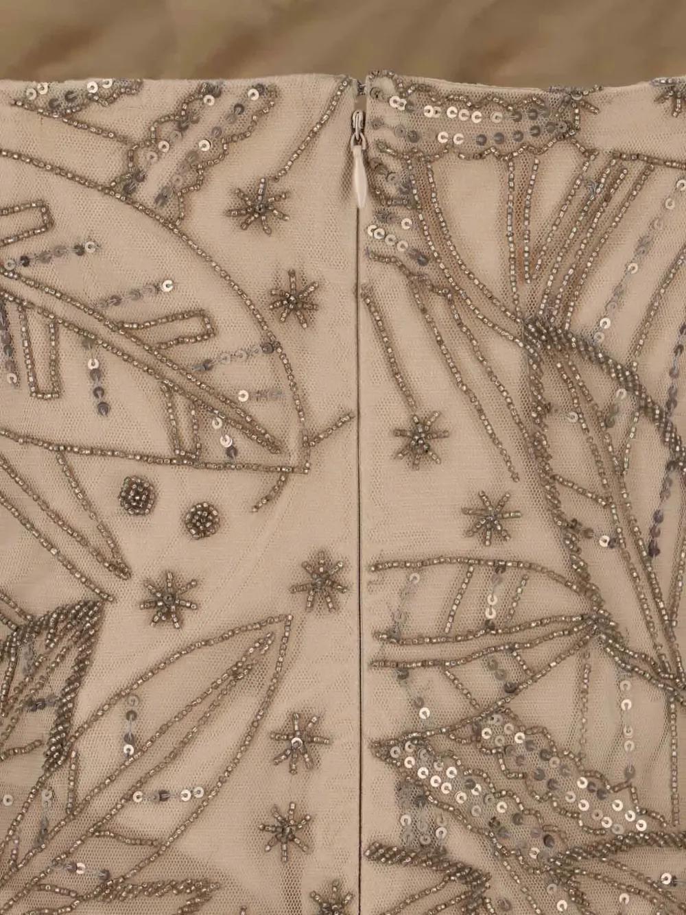 beige beaded leaf pattern sequin embellishment spaghetti straps concealed zip fastening centre back vent