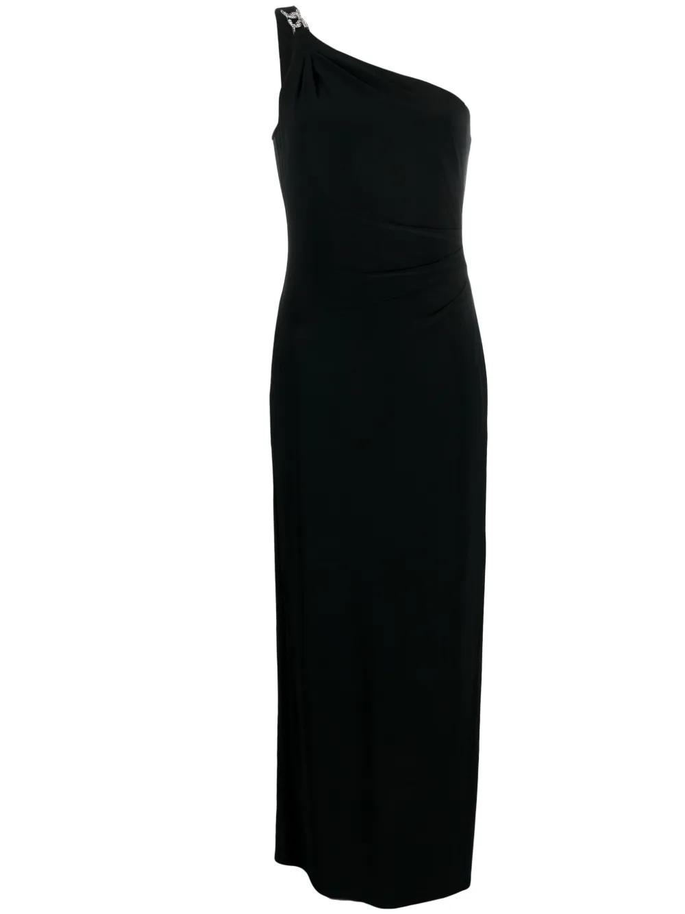 black chain-link detailing crystal embellishment one-shoulder sleeveless side slit mid-length straight hem