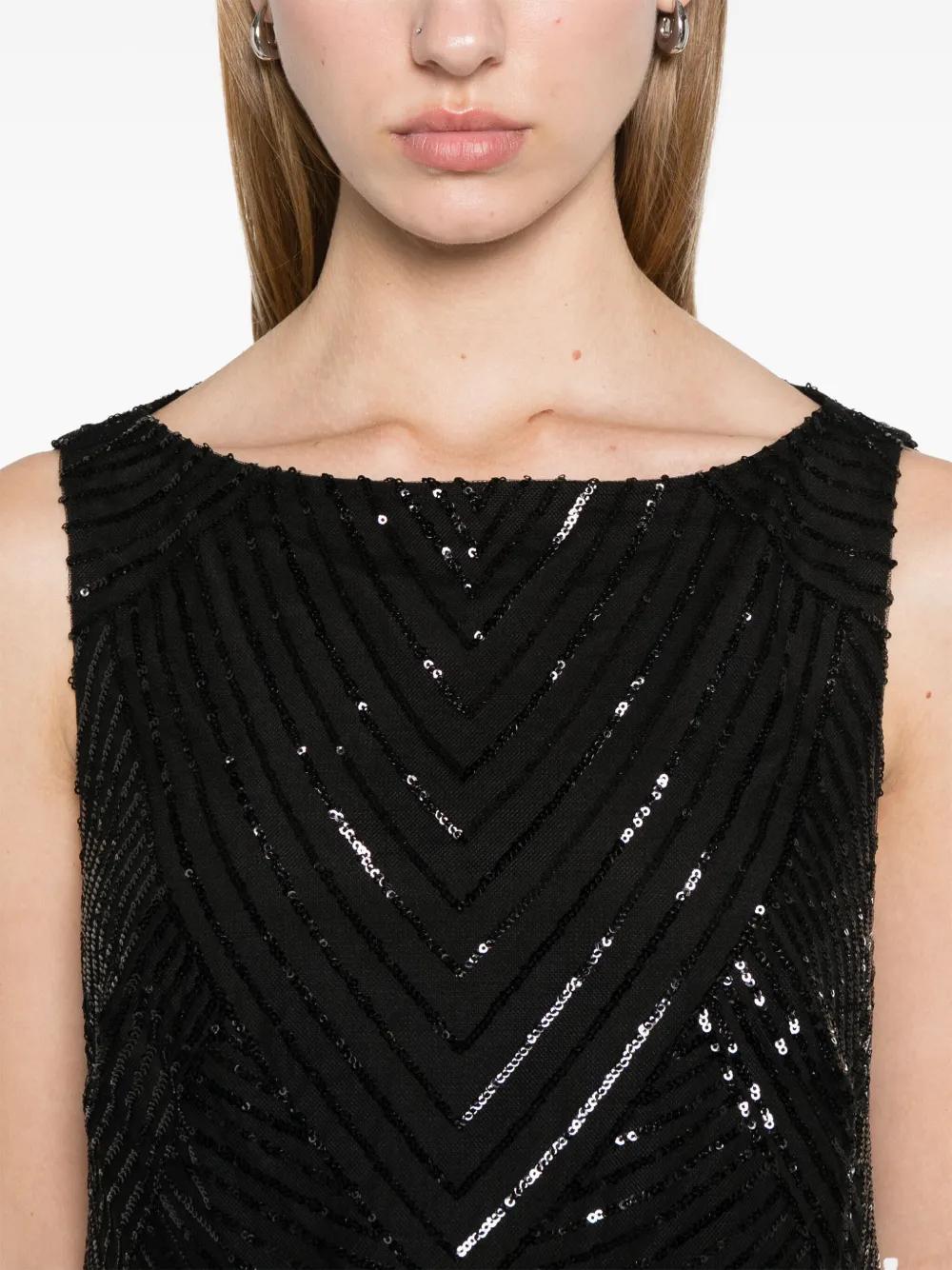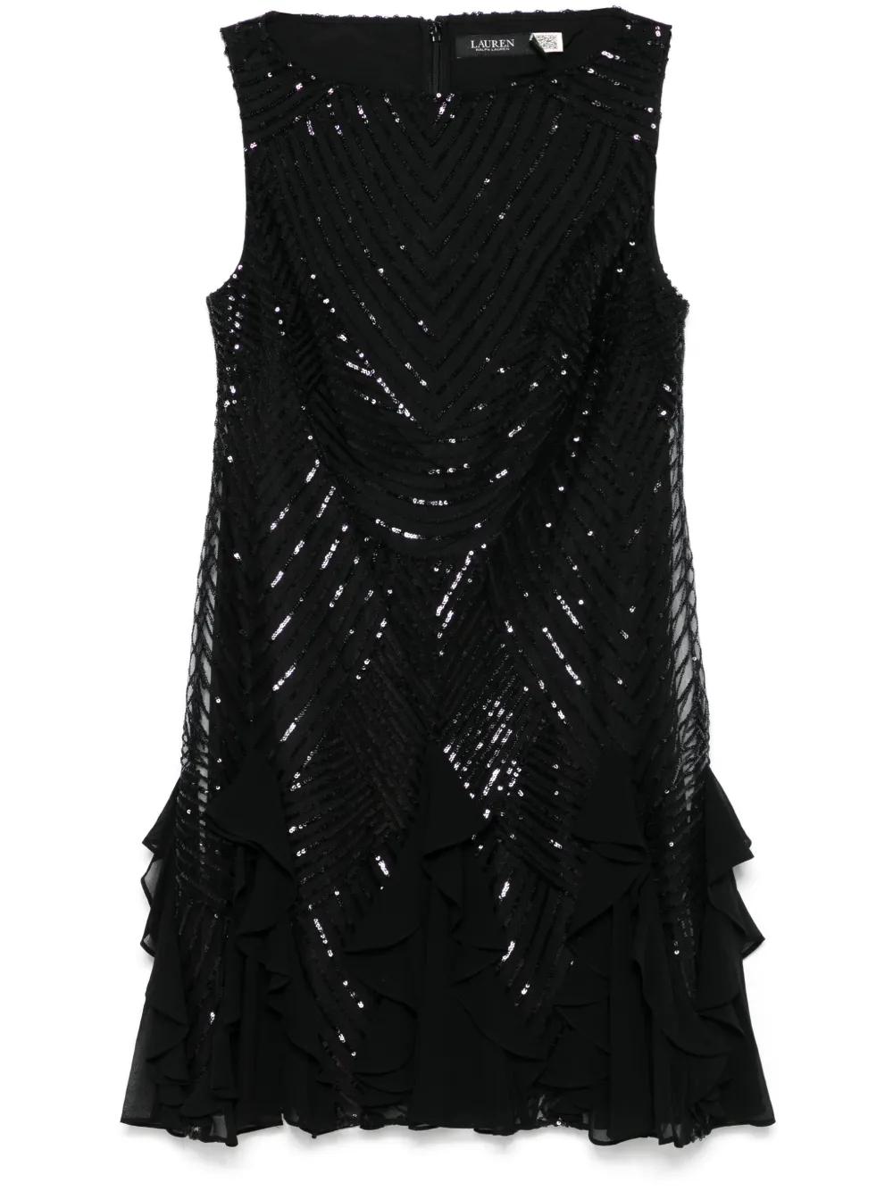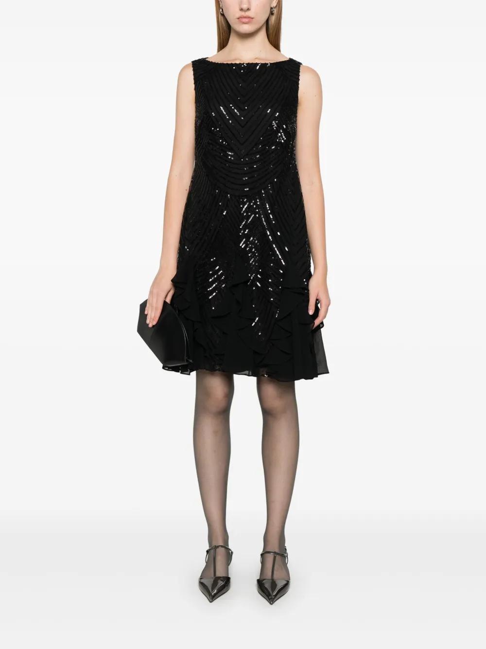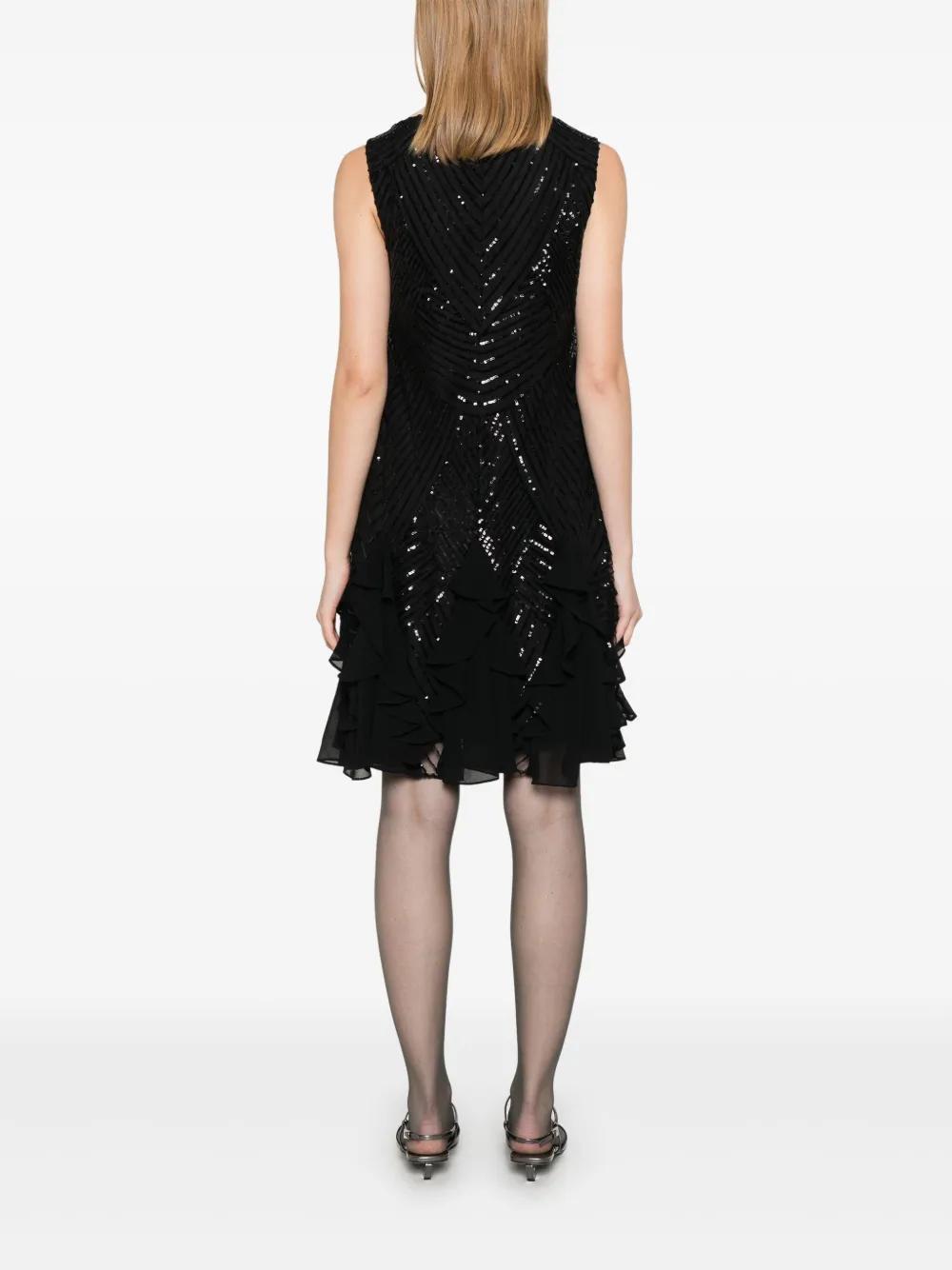 black recycled polyester mesh design sequin embellishment concealed rear hook and zip fastening boat neck sleeveless ruffled detailing full lining straight hem thigh-length