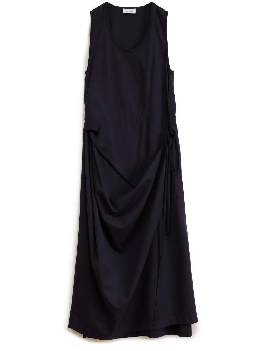 black cotton twill weave wrap design round neck sleeveless tied waist asymmetric hem mid-length