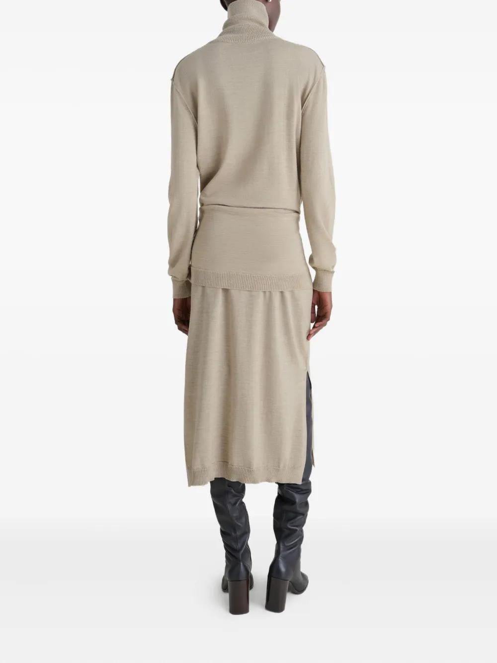 light taupe turtleneck neckline tie fastening long sleeves side slits rib-knit trim