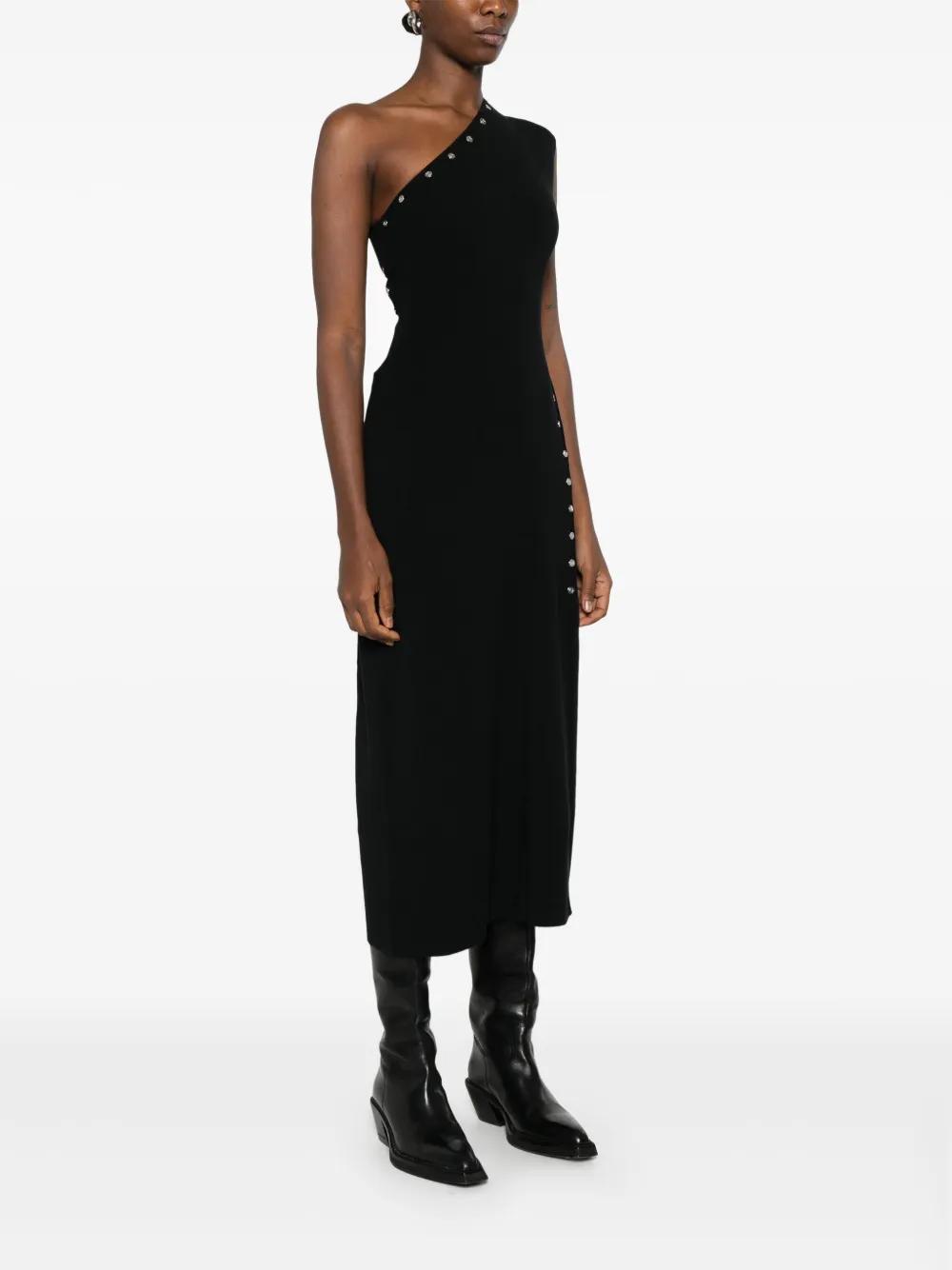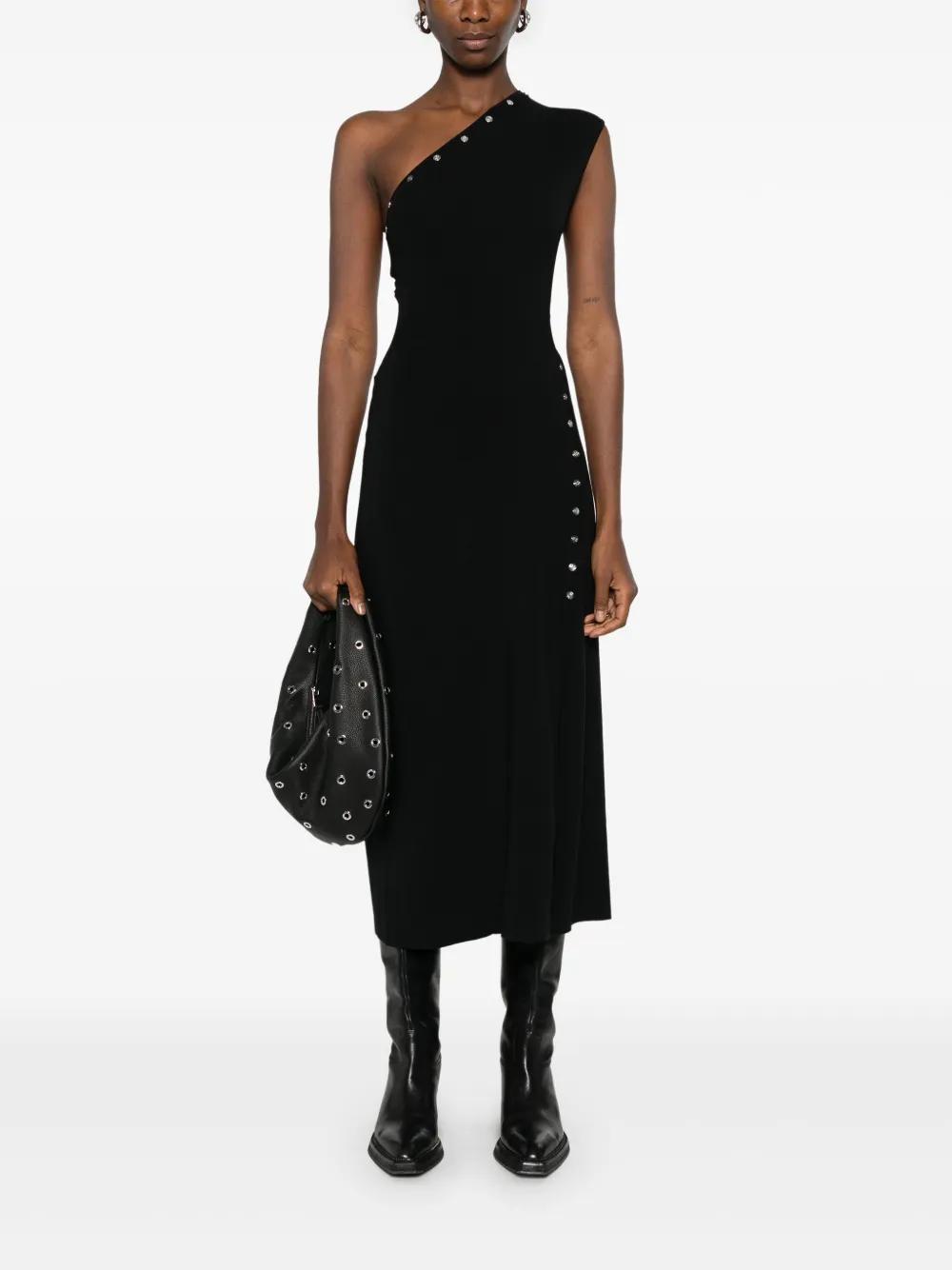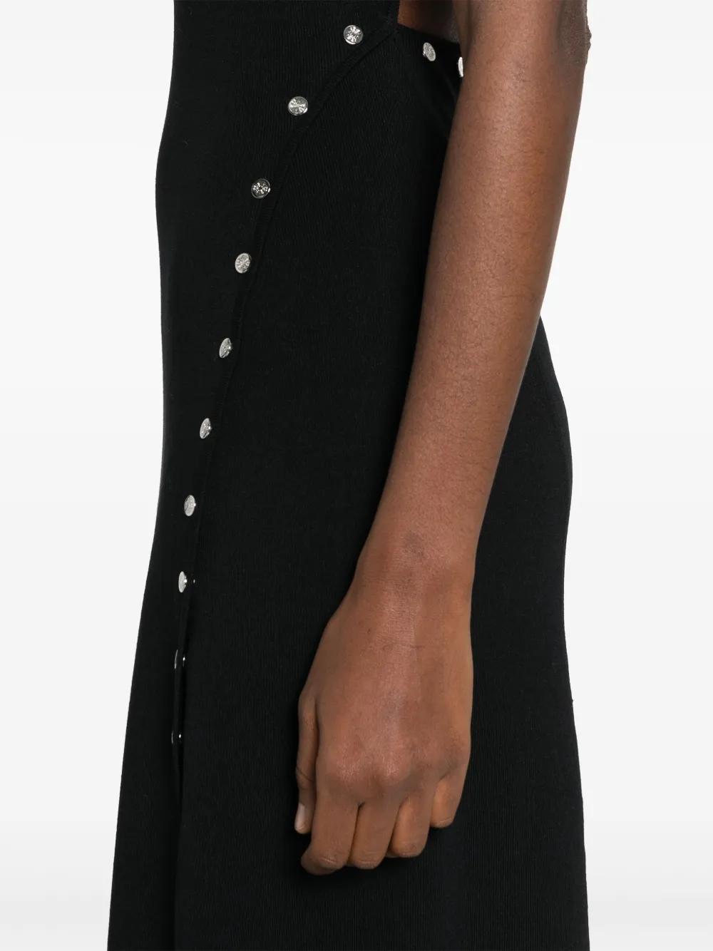 black fine ribbed stud embellishment Clover engraved buttons asymmetric neck sleeveless cut-out detailing side slit unlined straight hem mid-length